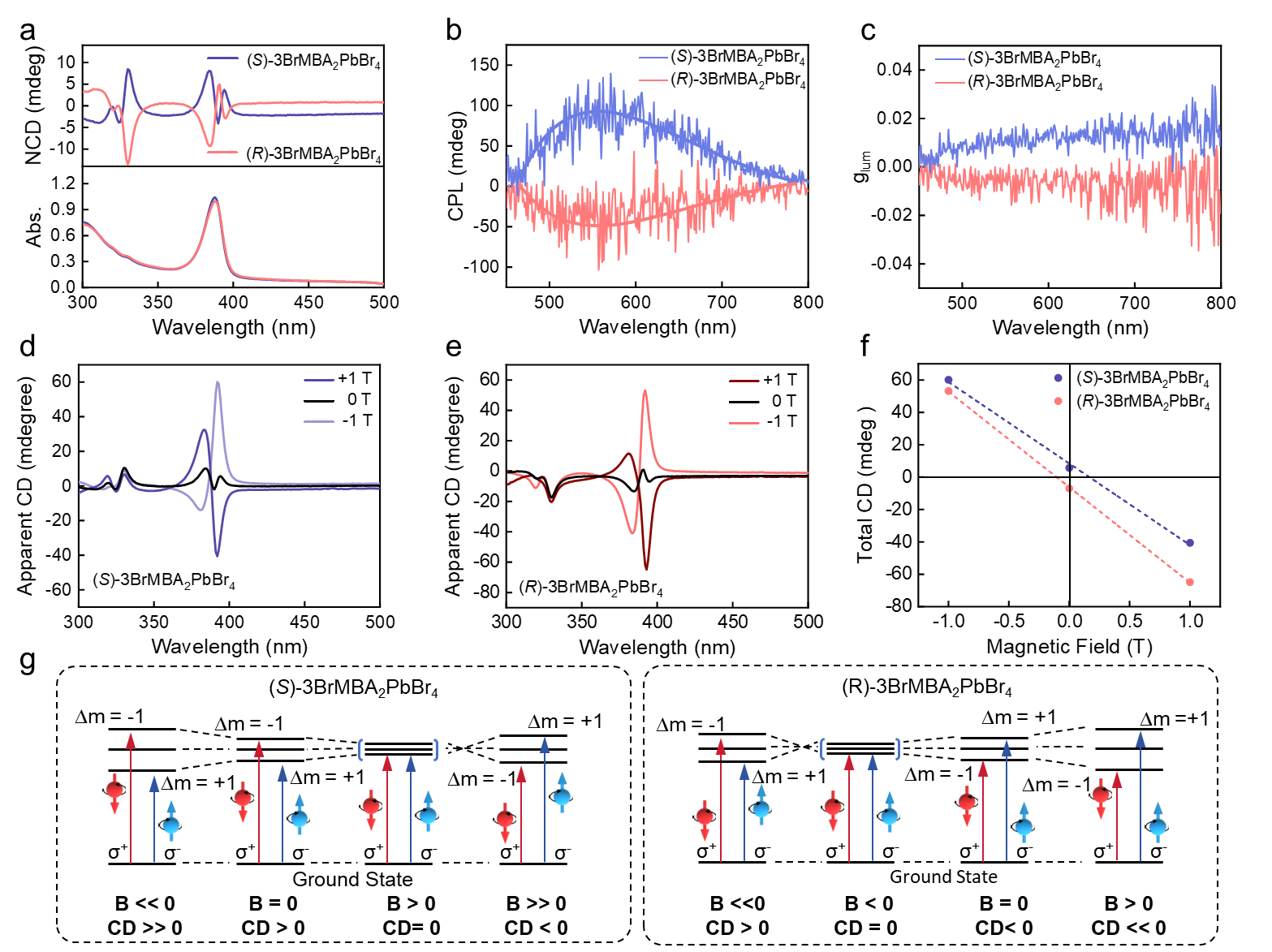 Figure 2. Circularly Polarized Optical Properties and Magneto-circular Dichroism (MCD) Spectra of (R/S)-3BrMBA₂PbBr₄