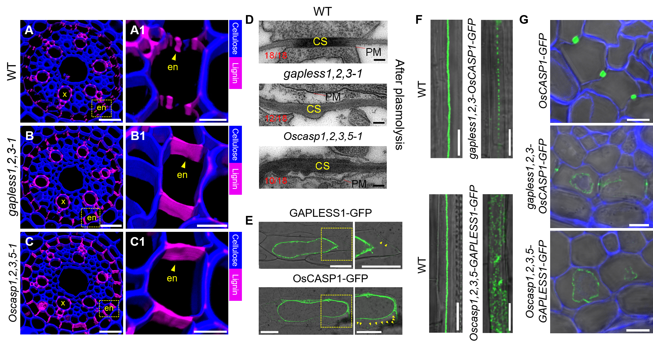Further investigation revealed that the GAPLESSOsCASP complex-mediated integrity of the Casparian strip is essential for maintaining ion homeostasis and ensuring the correct localization and abundance of multiple endodermis-expressed proteins, such as OsSGN3a and the silicon transporter Lsi1. Moreover, the study for the first time established the intrinsic relationship among Casparian strip integrity, suberin accumulation, expression of mineral transport proteins, and the OsSGN3-mediated compensatory mechanism (Figure 2). These findings provide a new perspective for comprehensively elucidating the molecular mechanisms of Casparian strip formation in rice endodermis and offer new insights into the role of Casparian strip integrity in regulating protein localization and abundance in plants.