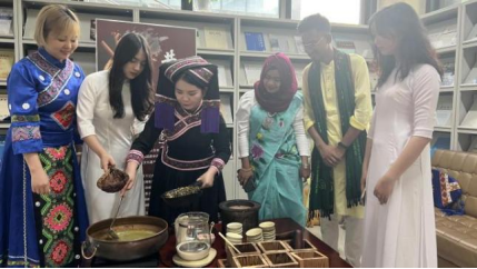 International students are immersing themselves in the culinary traditions of Guangxi by learning to prepare the local delicacy known as Guilin oil tea.