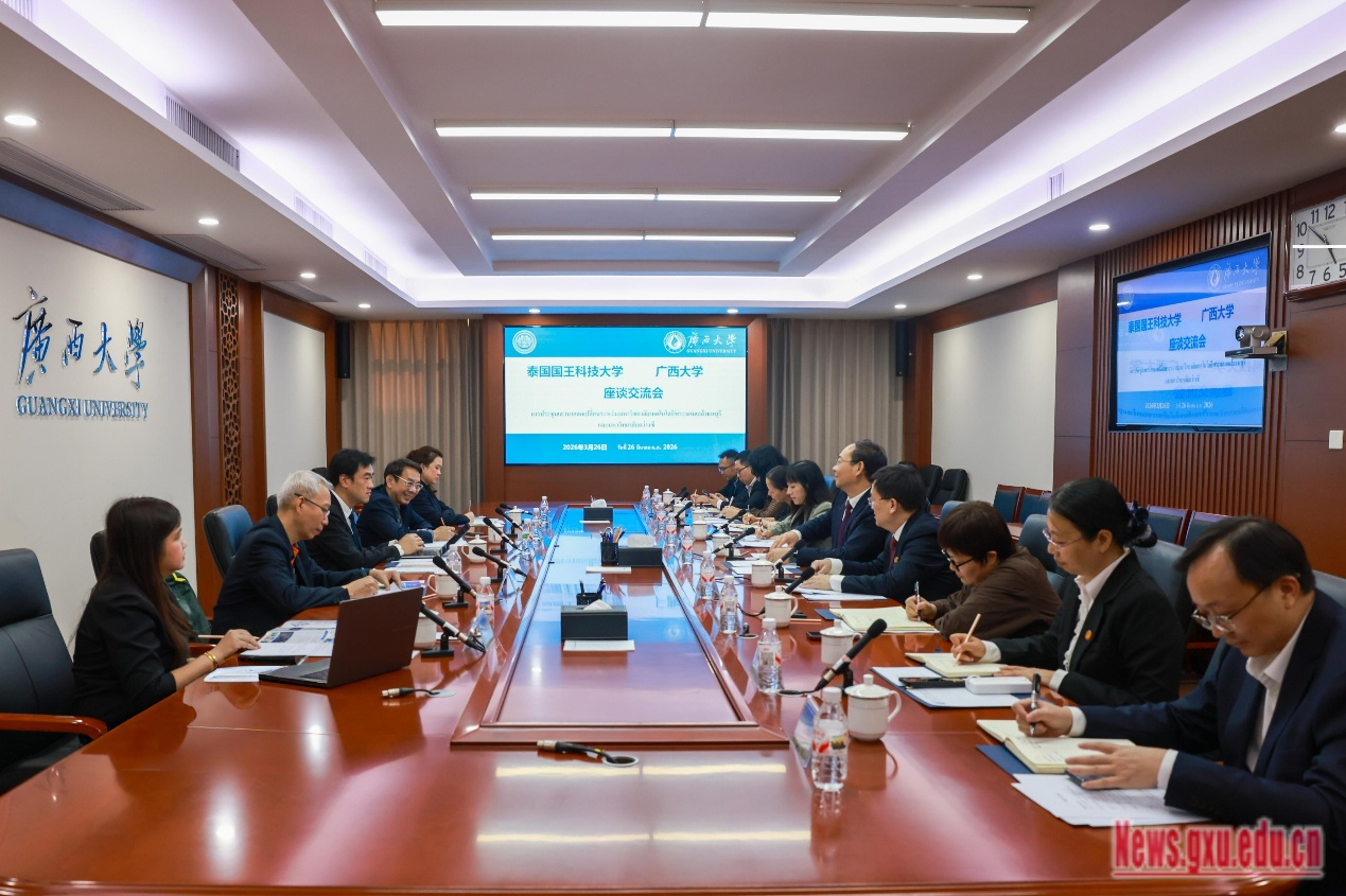 On March 26, a delegation from King Mongkut's University of Technology Thonburi (KMUTT), led by Vice President Chawin Chantharasenawong, visited Guangxi University. Vice President Yu Wenjin chaired the symposium and signed a memorandum of understanding (MOU) on cooperation between the two universities on behalf of Guangxi University.