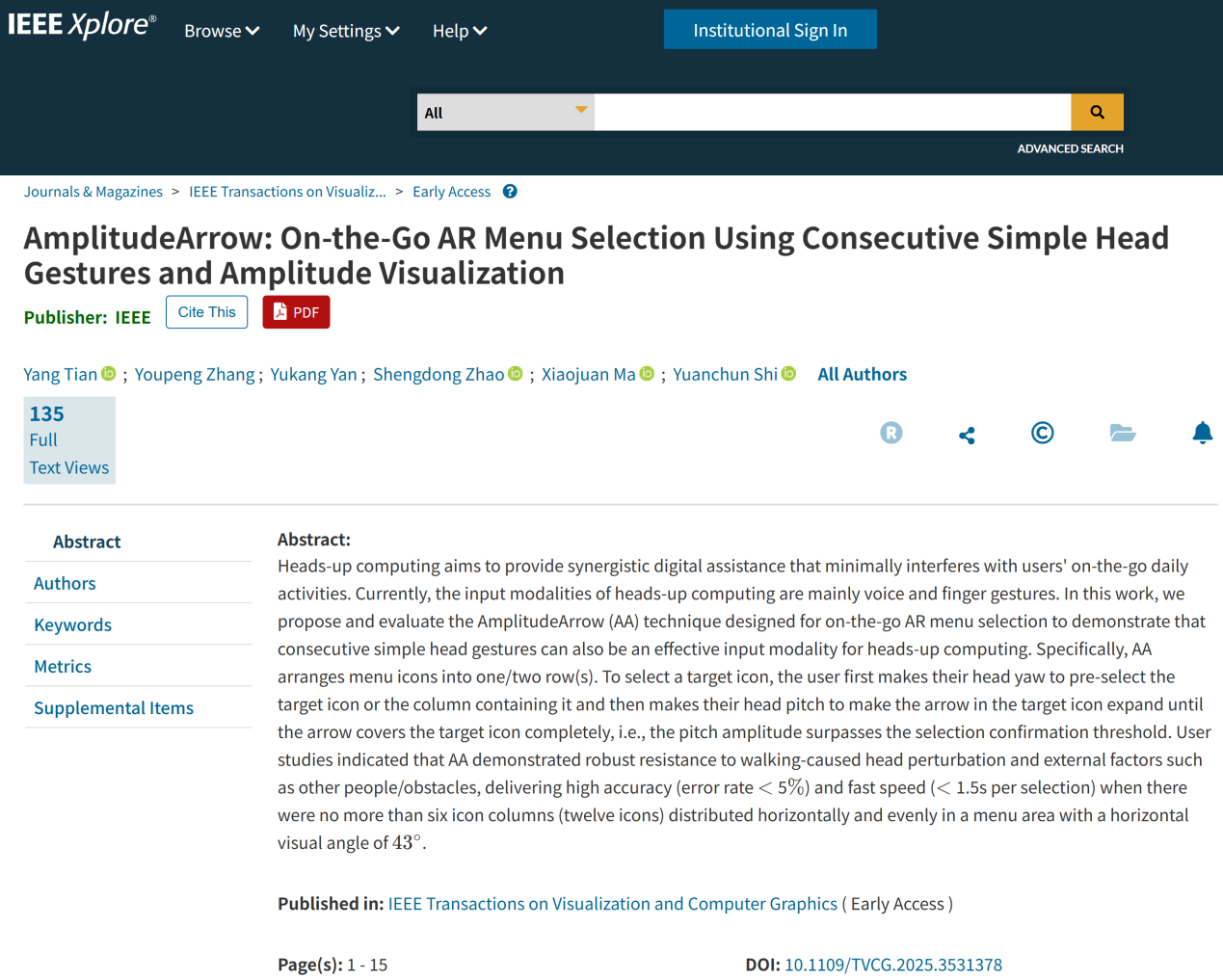 Recently, the Extended Reality (XR) Human-Computer Interaction team of Guangxi University has achieved three innovative research breakthroughs in the field of XR operating system graphical user interfaces. The studies, titled "SummonBrush: Enhancing Touch Interaction on Large XR User Interfaces by Augmenting Users' Hands with Virtual Brushes," "BoundaryScreen: Summoning the Home Screen in VR via Walking Outward," and "AmplitudeArrow: On-the-Go AR Menu Selection Using Consecutive Simple Head Gestures and Amplitude Visualization," have been successively published in IEEE Transactions on Visualization and Computer Graphics. All three papers list Associate Professor Tian Yang from the School of Computer , Electronics and Information as both first author and corresponding author, with GXU as the primary research affiliation.