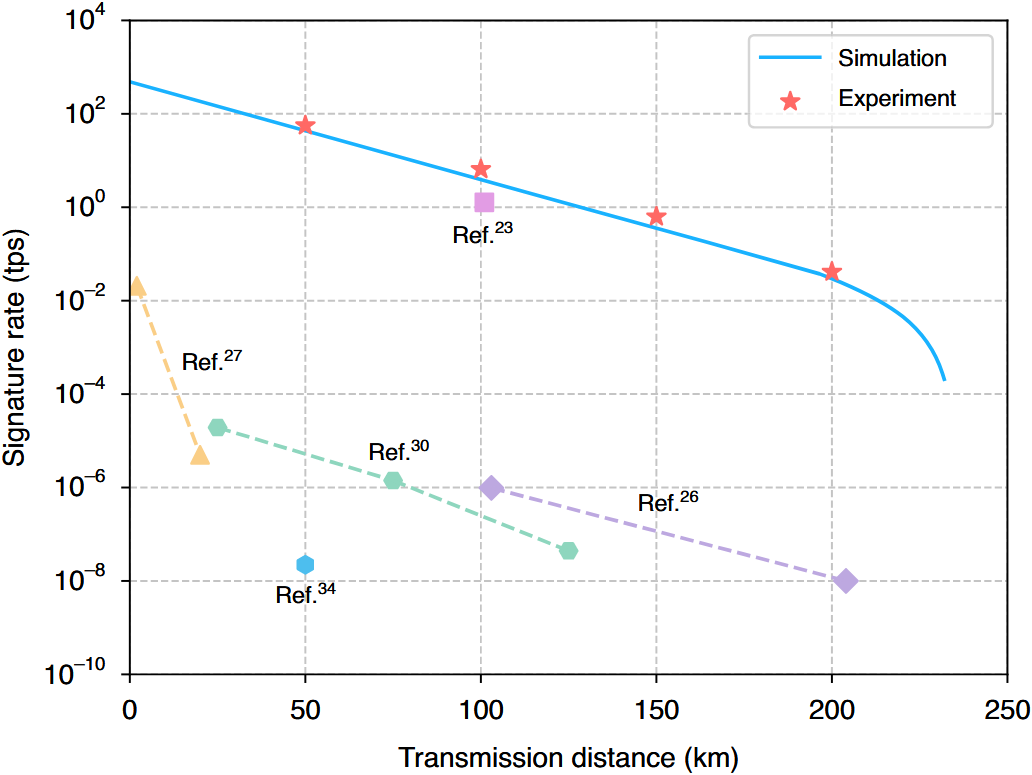 Using the proposed network design and a newly developed QDS protocol, the research team carried out a series of experiments at varying transmission distances. The results highlight key advances achieved in this study. In particular, the chip-based QDS system was able to sign a 1 Mbit file at a rate of 0.04 signatures per second over a 200-kilometer optical fiber link. This work represents a meaningful step toward the real-world application of QDS and holds promise for broader use in areas such as quantum e-commerce and quantum blockchain.