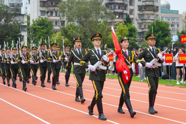 ເວລາ 8:00 ໂມງ, ພິທີຊັກທຸງໄດ້ເລີ່ມຂຶ້ນຢ່າງເປັນທາງການ. ບັນດາເຈົ້າໜ້າທີ່ຮັກສາທຸງຊາດໄດ້ພາກັນເດີນຂະບວນຢ່າງມີພະລັງ, ໄດ້ພາທຸງສີແດງຫ້າດາວໄປຫາເສົາທຸງ. ຫຼັງຈາກນັ້ນ, ຜູ້ຖືທຸງຊາດໄດ້ຍົກທຸງສີແດງຫ້າດາວຢູ່ໃນມືຂອງລາວ, ແລະທຸງຊາດສີແດງສົດໃສໄດ້ລຸກຂຶ້ນຊ້າໆ, ກະພິບໃນລົມແລະແສງສະຫວ່າງໃນຕອນເຊົ້າ. ສຽງ “ມີນາຂອງອາສາສະໝັກ” ດັງກ້ອງກັງວານໄປທົ່ວວິທະຍາເຂດ, ແລະ ບັນດາຄະນະວິຊາ ແລະ ນັກສຶກສາທັງໝົດໄດ້ຢືນຢູ່ຕໍ່ໜ້າທຸງຊາດຢ່າງສະຫງ່າຜ່າເຜີຍ, ສາຍຕາຂອງເຂົາເຫຼື້ອມໃສໃນຂະນະທີ່ເຂົາເຈົ້າຮ້ອງເພງແຫ່ງຊາດຮ່ວມກັນ.