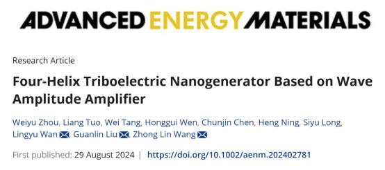 Based on multiple ocean field tests, the team discovered that under normal sea conditions, the actual wave amplitude is difficult to provide sufficient amplitude for the floating object TENG. In response, it proposed a surface wave amplitude amplifier and a lightweight four-helix structured TENG (FH-TENG). By utilizing the lever principle, this system converts the high-torque, low-amplitude motion of ocean waves into the low-torque, high-amplitude motion, resulting in a 60% increase of amplitude and a 235% enhancement of energy output. These research findings have been published on the internationally renowned journal Advanced Energy Materials (Advanced Energy Materials, 2024, DOI: 10.1002/aenm.202402781), with Weiyu Zhou, a 2022 master's student, as the first author, and Lingyu Wan, Guanlin Liu, and Zhonglin Wang as corresponding authors.