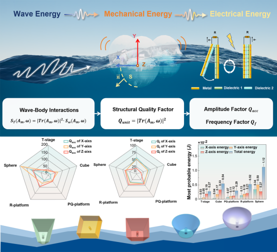 Understanding the dynamic laws of the interaction between waves and floating objects is the key to optimizing design for efficient collection of surface wave energy in seawater. The team introduced the theory of stochastic waves and spectral analysis based on the stochastic signal characteristics of ocean waves, and proposed for the first time the quantitative evaluation of the structural quality factor of the shell's ability to harvest wave energy from the perspectives of statistics and energy transfer. It also developed an evaluation method for the degree of wave-object coupling compatibility of TENG devices, providing fundamental guidance for the design of efficient harvesting wave energy with TENG devices and the selection of internal energy harvesting directions. The research finding has been published on internationally renowned journal Advanced Science (Advanced Science, 2024, 202405165), with Dongxin Guo, a 2021 master's student, as the first author, and Lingyu Wan, Guanlin Liu, and Junyi Zhai as corresponding authors.