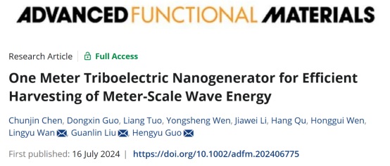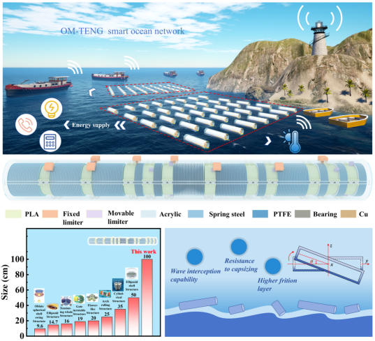 Besides, the team discovered that large-sized floating objects are beneficial for the conversion of actual ocean wave energy. They designed and produced the industry's first one-meter sized wave energy triboelectric nanogenerator, achieving a single cycle charge transfer of 60.82 µC and a triboelectric layer surface area density of 1.76 cm¹. By integrating a segmented limiter device to control different sliders, they achieved effective contact-separation between multiple TENG units, resulting in high efficiency of energy harvesting, high sensitivity of wave responses, and excellent anti-overturning capabilities. These findings were published on internationally renowned journal Advanced Functional Materials (Advanced Functional Materials, 2024, 2406775), with Chunjin Chen, a 2021 master's student, as the first author, and Lingyu Wan, Guanlin Liu, and Hengyu Guo as corresponding authors.