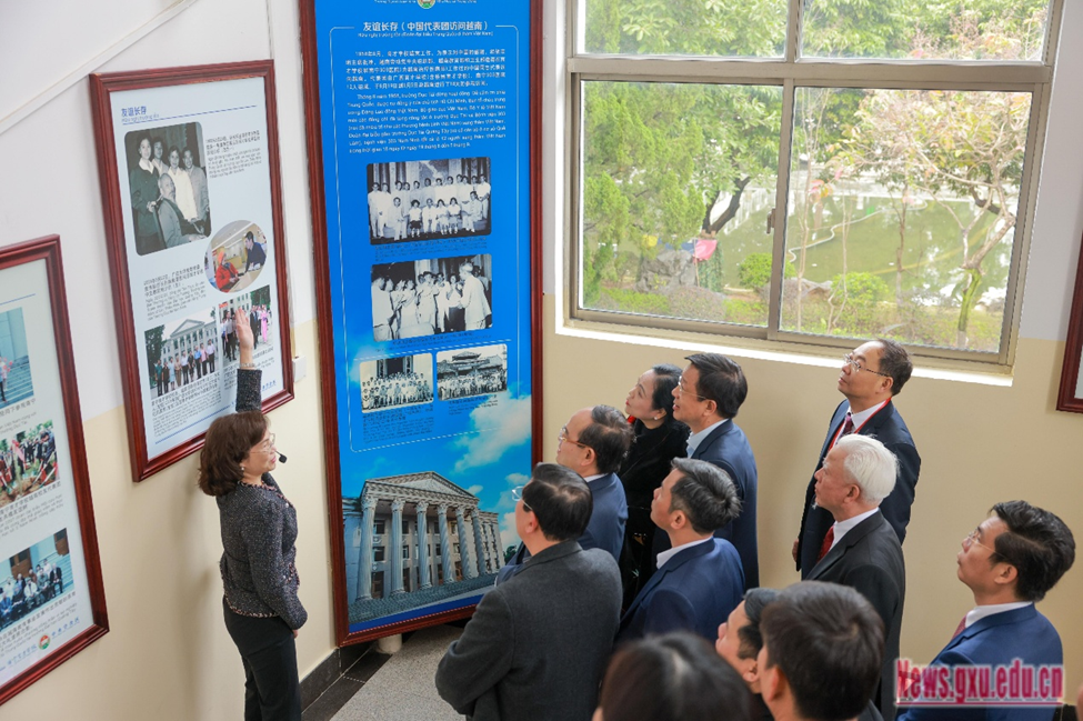 នៅសាលប្រជុំ Grand Auditorium នៃសាកលវិទ្យាល័យ Guangxi (អតីតជាអគារថ្នាក់រៀនរបស់សាលា Nanning Yucai) គណៈប្រតិភូបានស្តាប់ការណែនាំអំពីប្រវត្តិរបស់ស្ថាប័ន និងបានទស្សនាការតាំងពិព័រណ៍រូបថតក្រោមប្រធានបទ "ចំណងនៃ Yucai ចំណងមិត្តភាពចិន-វៀតណាម"។ ពួកគេទទួលបានការយល់ដឹងស៊ីជម្រៅអំពីការផ្លាស់ប្តូរការអប់រំរបស់សាកលវិទ្យាល័យក្វាងស៊ីជាមួយវៀតណាមក្នុងយុគសម័យថ្មី និងសមិទ្ធិផលសហប្រតិបត្តិការដែលសម្រេចបាន។ គណៈប្រតិភូបានវាយតម្លៃខ្ពស់ចំពោះការរួមចំណែកជាប្រវត្តិសាស្ត្ររបស់សាលា Nanning Yucai ក្នុងការបណ្តុះបណ្តាលបុគ្គលិកបដិវត្តន៍ និងកសាងប្រទេសជាតិមួយចំនួនធំសម្រាប់វៀតណាម។ ពួកគេបានទទួលស្គាល់យ៉ាងពេញទំហឹងនូវការខិតខំប្រឹងប្រែងរបស់សាកលវិទ្យាល័យក្វាងស៊ី ក្នុងការឆ្ពោះទៅមុខនូវមរតកប្រវត្តិសាស្ត្រដ៏ជ្រាលជ្រៅនៃ "ចំណងនៃយូកៃ ចំណងមិត្តភាពចិន-វៀតណាម" និងលទ្ធផលជាផ្លែផ្កាដែលសម្រេចបានក្នុងការផ្លាស់ប្តូរអប់រំ និងកិច្ចសហប្រតិបត្តិការជាមួយវៀតណាម។ គណៈប្រតិភូបានសម្តែងក្តីសង្ឃឹមសម្រាប់ការបន្តកិច្ចសហប្រតិបត្តិការកាន់តែស៊ីជម្រៅជាមួយសាកលវិទ្យាល័យ Guangxi លើវិស័យដូចជាការបណ្តុះទេពកោសល្យ និងការផ្លាស់ប្តូរយុវជន ព្រមទាំងបានបន្តការអញ្ជើញដោយស្មោះស្ម័គ្រចំពោះថ្នាក់ដឹកនាំសាកលវិទ្យាល័យដើម្បីដឹកនាំគណៈប្រតិភូមកបំពេញទស្សនកិច្ចនៅវៀតណាម។