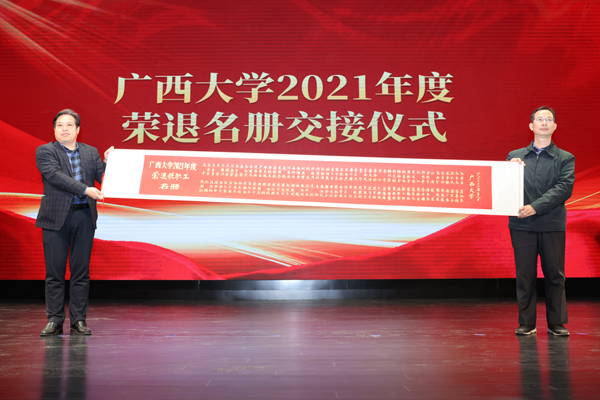 荣退仪式上,人力资源处、离退休工作处进行了beat365英国官方网站2021年度荣退名册交接,精致装裱的荣退名册手写着2021年度荣退教职工名字,体现学校对退休教职工几十年兢兢业业为党工作、踏踏实实为校服务的敬重和肯定。
