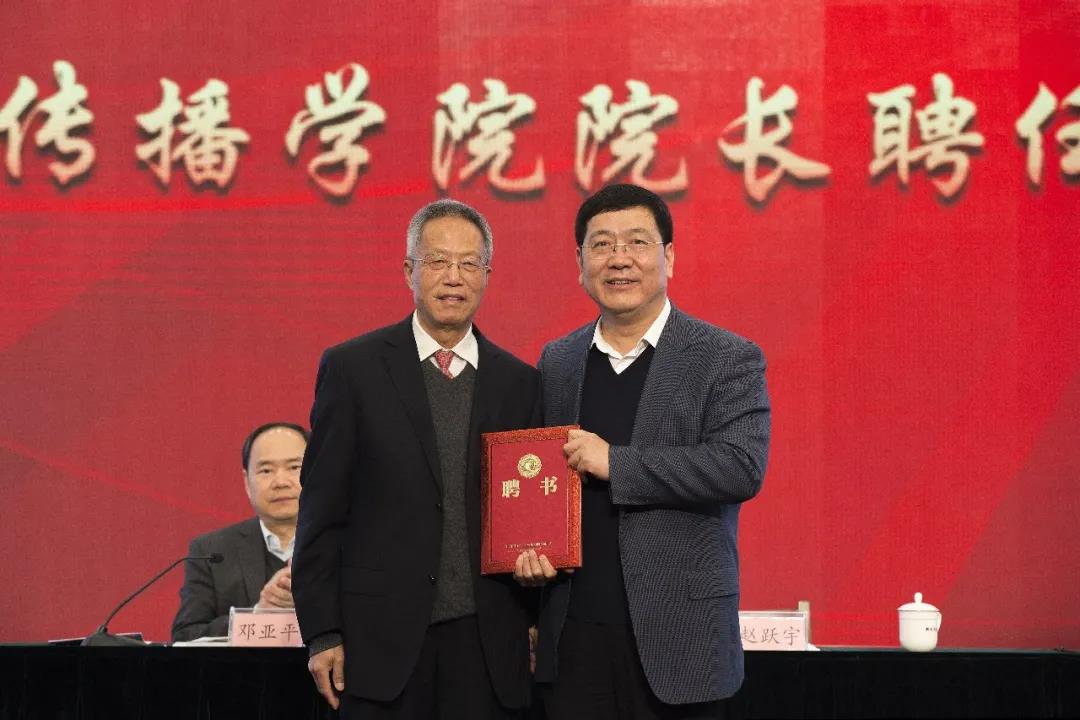 图为郑保卫教授(左)2017年底在院长聘任仪式上跟beat365英国官方网站赵跃宇校长合影。