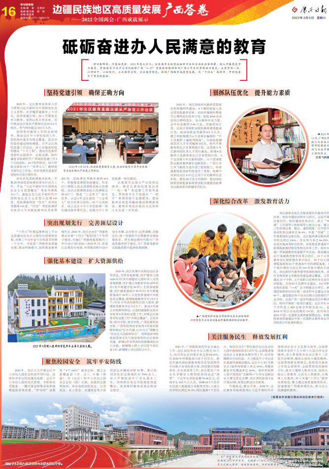 律回春晖渐,万象始更新。2021年意义非凡,全区教育系统坚决按照中央和自治区决策部署,深入开展党史学习教育,贯彻落实习近平总书记视察广西“4·27”重要讲话精神和对广西工作系列重要指示要求,注重学用一体、以学促干、以知促行,立足教育实际、突出教育特色,推动广西教育高质量发展,为“十四五”起好步、开好局奠定了坚实的基础。