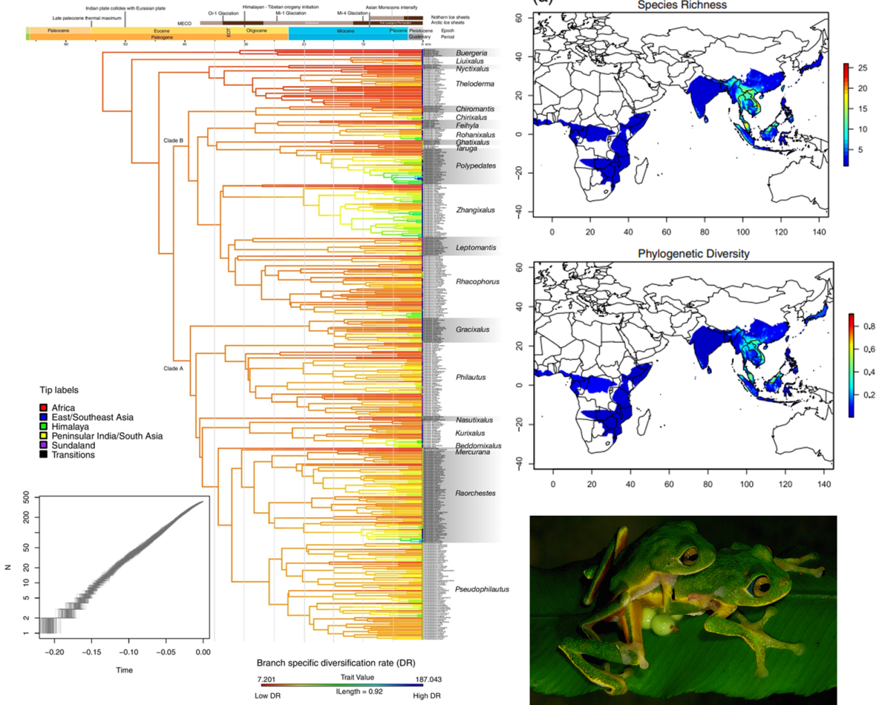 该研究使用最新的数据分析方法,对东半球树蛙科415个物种现有的全部基因组和多基因序列数据进行分类归并,构建生成了迄今为止最为全面的系统发育树。结果表明,在东半球树蛙科整个系统发育过程中,物种分化速率几乎是恒定的,但物种丰富度的分布却很不均匀、在演化过程中有明显聚集现象。其中,岛屿上的高海拔地区和一些具有阴冷潮湿气候的大陆地区呈现较高的物种多样性和独特的分类群。