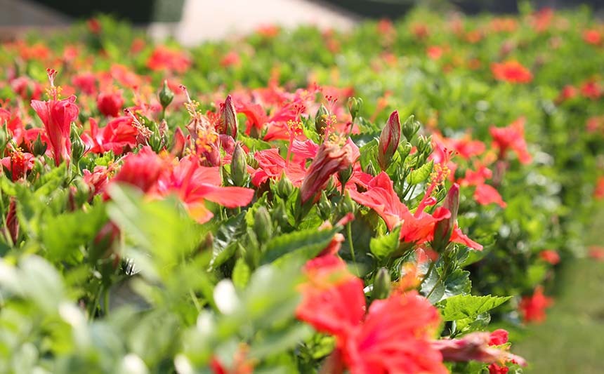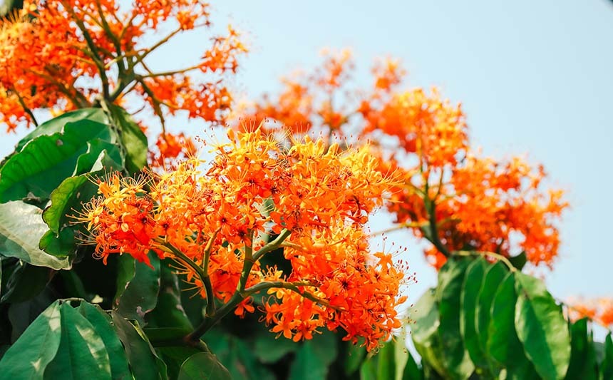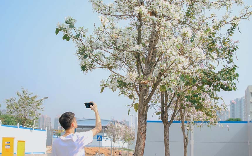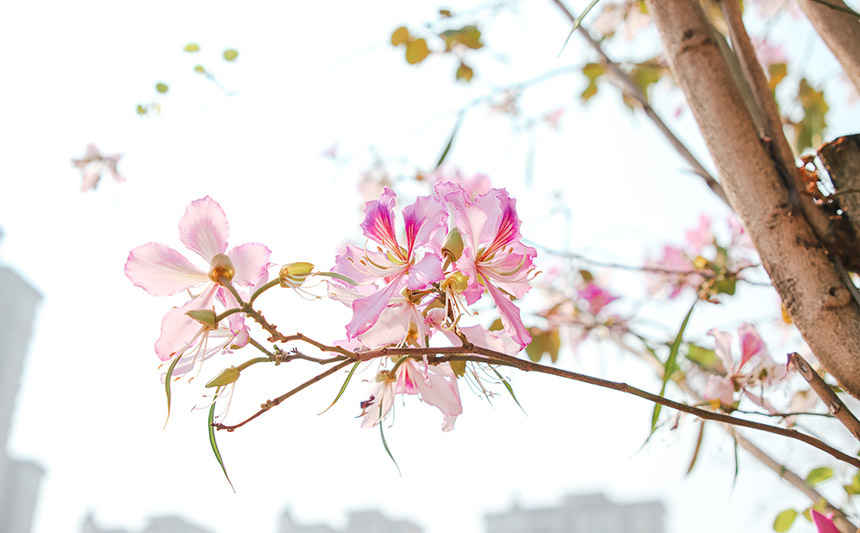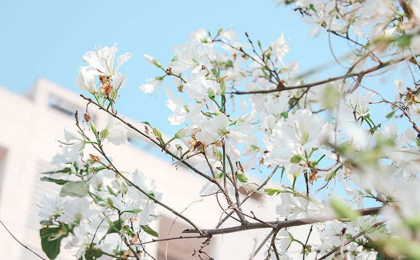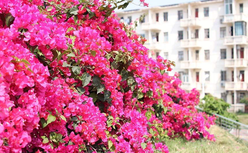 近日,beat365英国官方网站迎来花期。洋紫荆、三角梅、朱瑾等花朵相继绽放,点缀了校园的春天,共同构成了一道秀丽的风景线,不时引来行人驻足观赏,拍照留念。图为蓝天下的白洋紫荆。