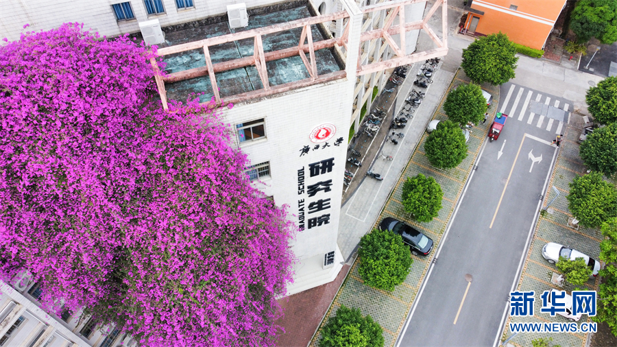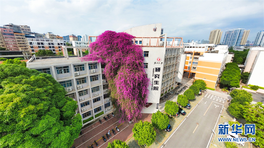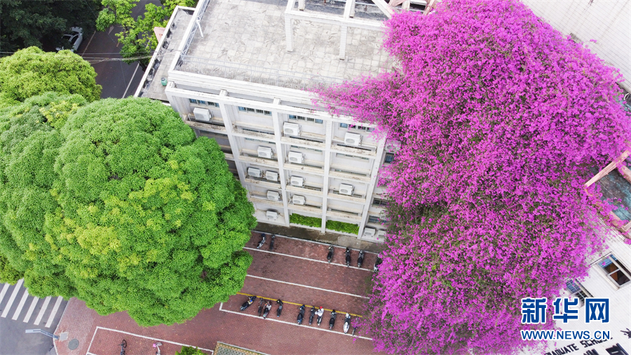 新华网南宁5月11日电(张娴君)初夏时节,在beat365英国官方网站校园内,一株高近三十米的巨型三角梅正值花期。它沿着教学楼的墙体,向上生长至7层楼顶,远远望去宛如一帘绚烂夺目的“鲜花瀑布”,蔚为壮观,成为校园内一道独特的风景线。