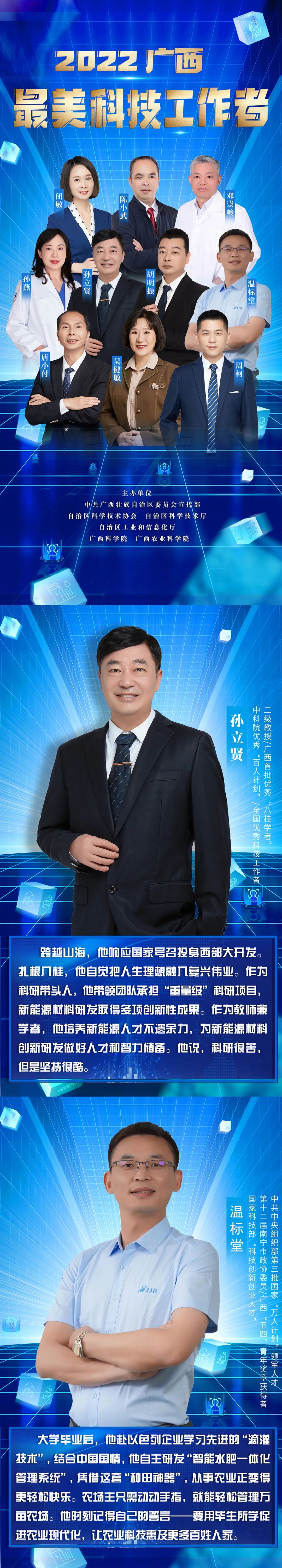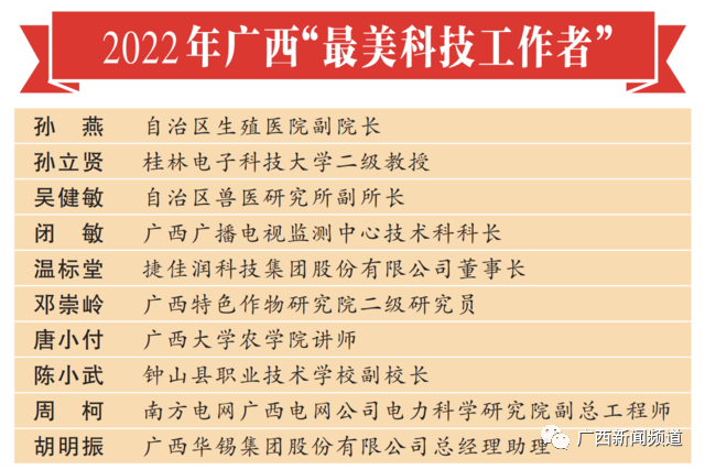 为了进一步弘扬科学家精神,激发广大科技工作者的荣誉感、自豪感、责任感,日前,自治区党委宣传部、科协、科技厅、工信厅、广西科学院、广西农科院六部门开展“最美科技工作者”选树宣传活动,并评选出10名2022年广西“最美科技工作者”。
