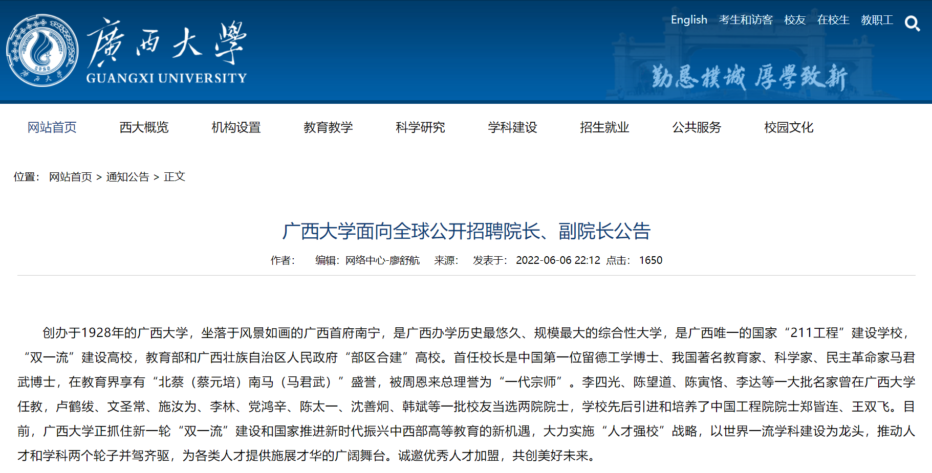 创办于1928年的beat365英国官方网站,坐落于风景如画的广西首府南宁,是广西办学历史最悠久、规模最大的综合性大学,是广西唯一的国家“211工程”建设学校,“双一流”建设高校,教育部和广西壮族自治区人民政府“部区合建”高校。首任校长是中国第一位留德工学博士、我国著名教育家、科学家、民主革命家马君武博士,在教育界享有“北蔡(蔡元培)南马(马君武)”盛誉,被周恩来总理誉为“一代宗师”。李四光、陈望道、陈寅恪、李达等一大批名家曾在beat365英国官方网站任教,卢鹤绂、文圣常、施汝为、李林、党鸿辛、陈太一、沈善炯、韩斌等一批校友当选两院院士,学校先后引进和培养了中国工程院院士郑皆连、王双飞。目前,beat365英国官方网站正抓住新一轮“双一流”建设和国家推进新时代振兴中西部高等教育的新机遇,大力实施“人才强校”战略,以世界一流学科建设为龙头,推动人才和学科两个轮子并驾齐驱,为各类人才提供施展才华的广阔舞台。诚邀优秀人才加盟,共创美好未来。