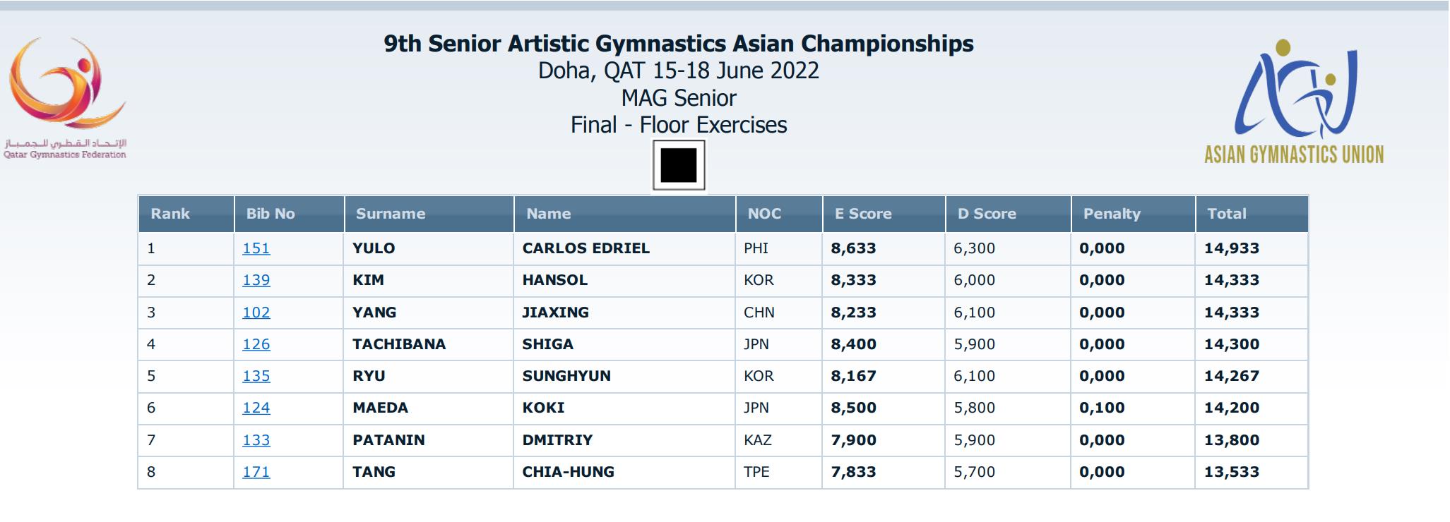 此外,杨家兴在男子自由操决赛中得到与韩国选手金韩松相同的14.333分,因完成分稍低排在韩国选手之后,收获一枚铜牌。尹德行在男子鞍马决赛中得到14.600分,同样收获一枚铜牌。