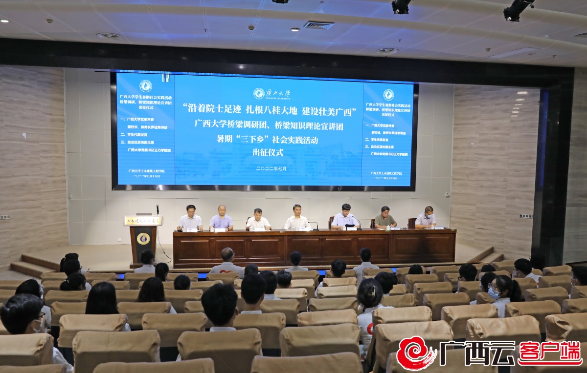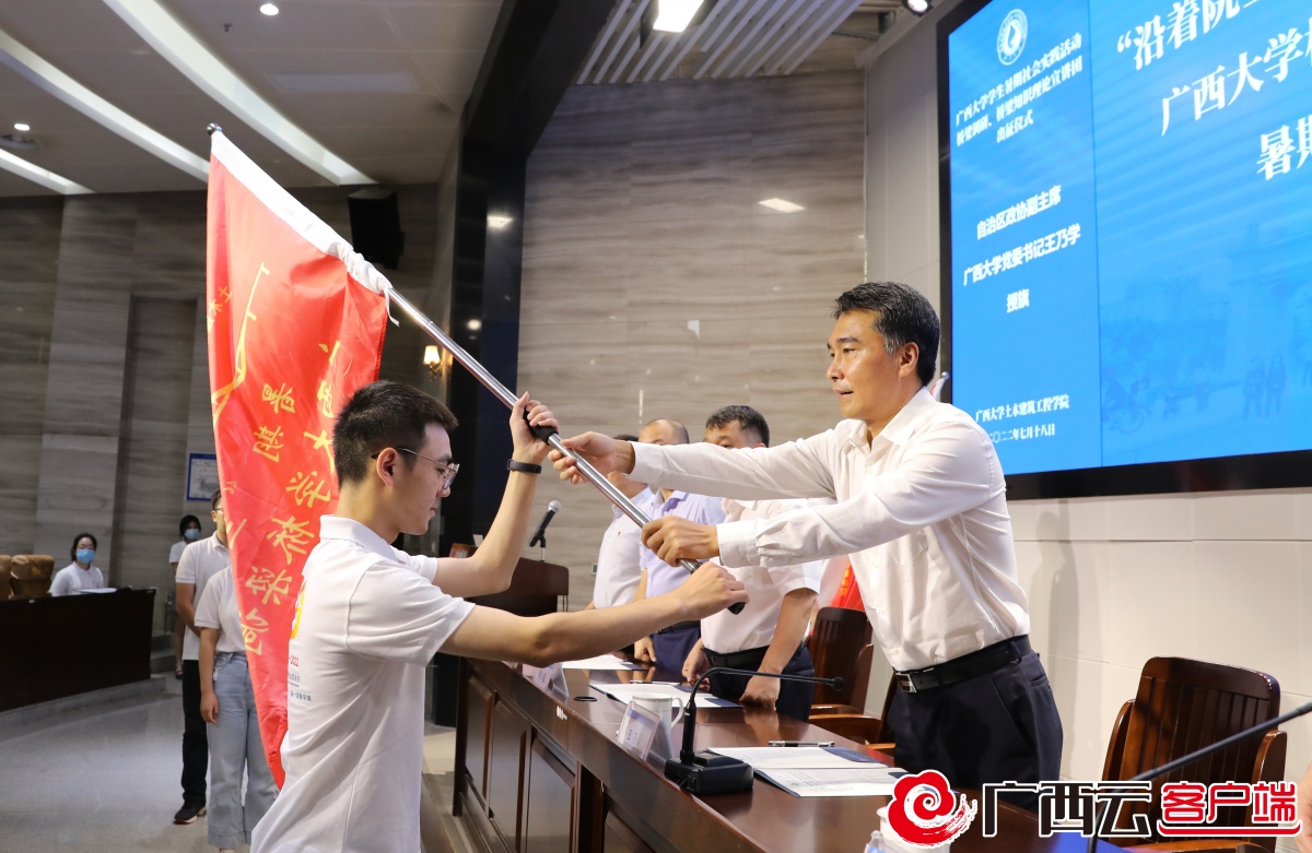 7月18日,“沿着院士足迹、扎根八桂大地、建设壮美广西”beat365英国官方网站桥梁调研团、桥梁知识理论宣讲团暑期“三下乡”社会实践活动出征仪式在土木建筑工程学院举行。自治区政协副主席、beat365英国官方网站党委书记王乃学出席出征仪式并为实践队授旗。