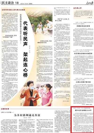 日前,习近平总书记在新疆考察时强调,“社区工作连着千家万户,要充分发挥社区基层党组织的战斗堡垒作用,把工作重心下沉,紧贴各族居民所思所想所盼,帮助大家办好事、办实事、解难题”。围绕如何做好社区工作,记者采访了4位全国人大代表,请他们谈谈意见建议。