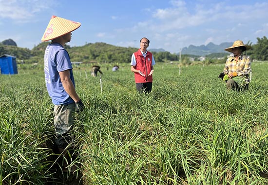 唐小付(中)到乔利乡乐圩村指导韭菜花生产。陈宏昊摄