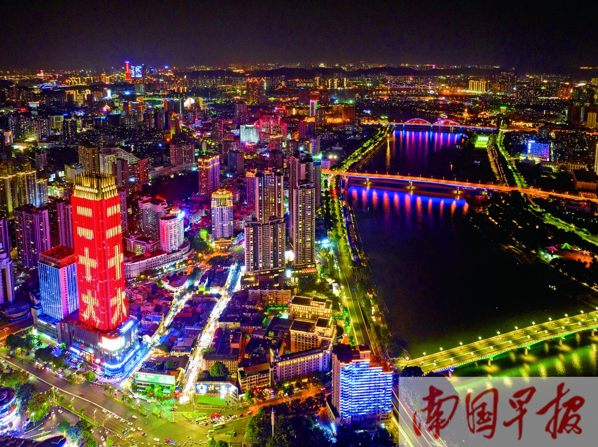 10月16日晚,南宁市多座楼宇上演绚丽多彩的灯光秀,热烈庆祝党的二十大胜利召开。南国早报记者 邹财麟 摄