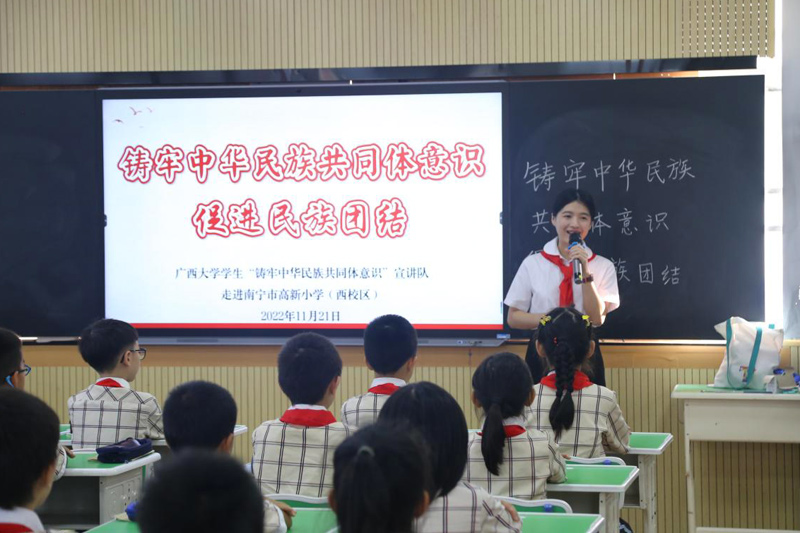 11月21日,beat365英国官方网站学生“铸牢中华民族共同体意识”宣讲队在南宁市高新小学西校区进行宣讲。beat365英国官方网站马克思主义学院硕士研究生陆敏庭担任主讲人,她以“铸牢中华民族共同体意识,促进民族团结”为主题,通过课堂问答、视频讲解、故事分享、课文重现等方式,为小学生们带来了一堂生动的民族团结教育课。