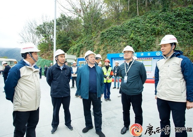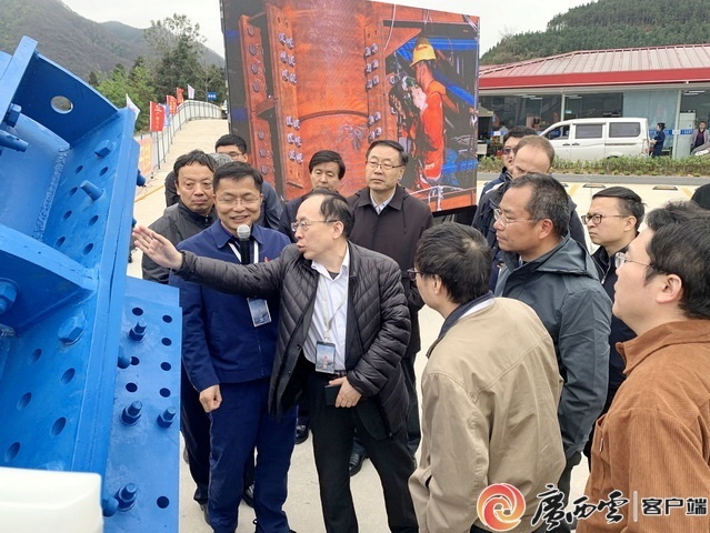 广西交通投资集团党委书记、董事长周文(中)向观摩团成员介绍天峨龙滩特大桥建设情况。广西交通投资集团 供图