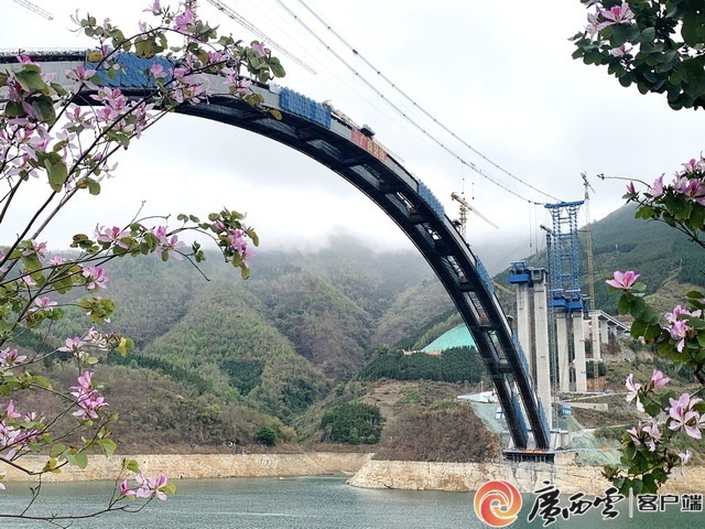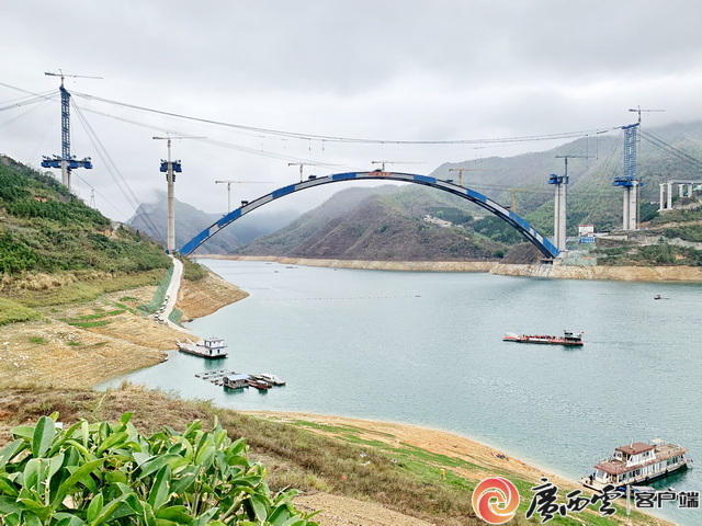 19日,记者在位于广西河池市天峨县龙滩大坝上游6公里处的天峨龙滩特大桥建设现场看到,横跨两岸青山的大桥气势恢宏。