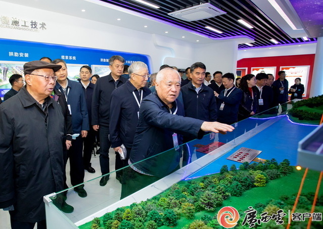 中国工程院院士郑皆连(中)向观摩团成员介绍特大桥复杂地理环境。广西交通投资集团 供图