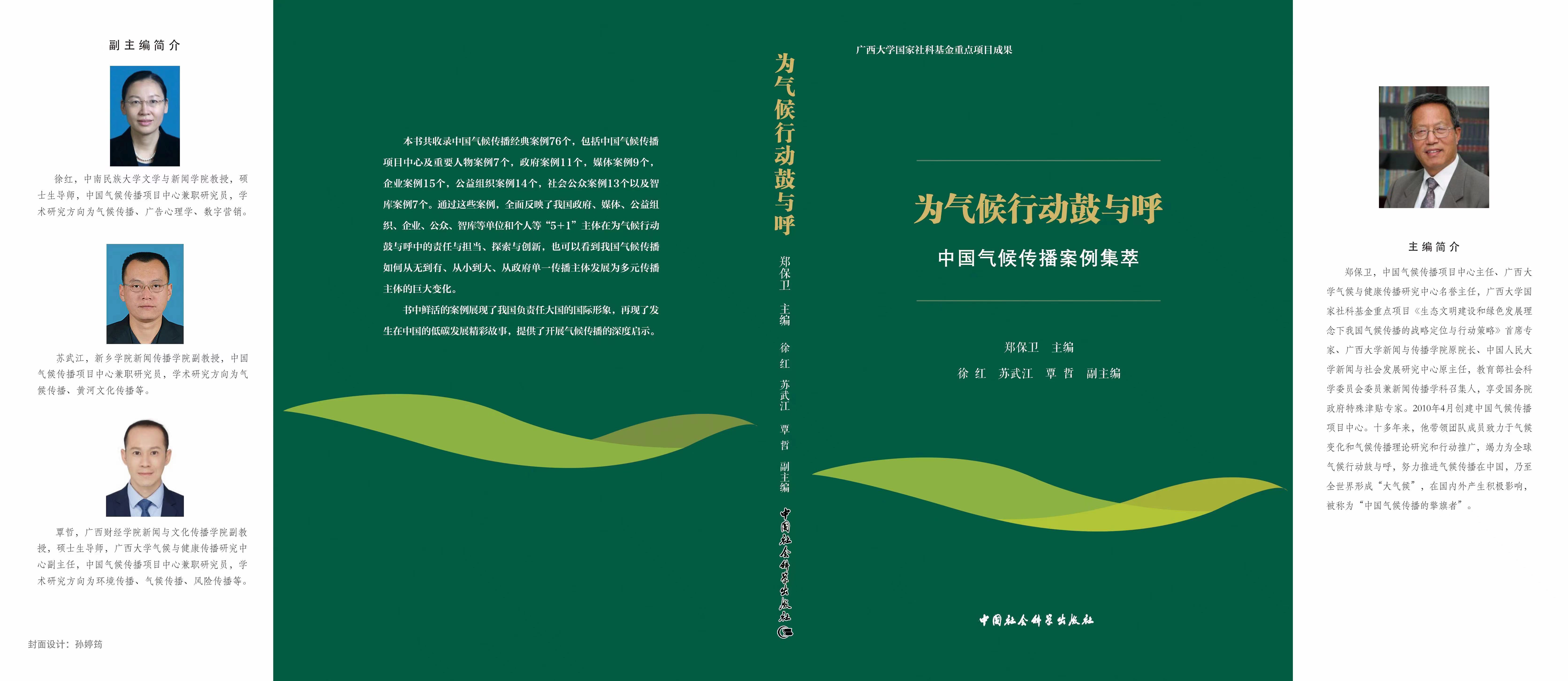 由中国气候传播项目中心主任、beat365英国官方网站特聘君武荣誉教授、中国人民大学新闻与社会发展研究中心原主任郑保卫教授主编的《为气候行动鼓与呼——中国气候传播案例集萃》一书,近期已由中国社会科学出版社。此书是郑保卫教授主持的beat365英国官方网站国家社科基金重点项目《生态文明建设和绿色发展理念背景下我国气候传播的战略定位与行动策略》(19AXW006)的研究成果之一。徐红、苏武江、覃哲为该书副主编。