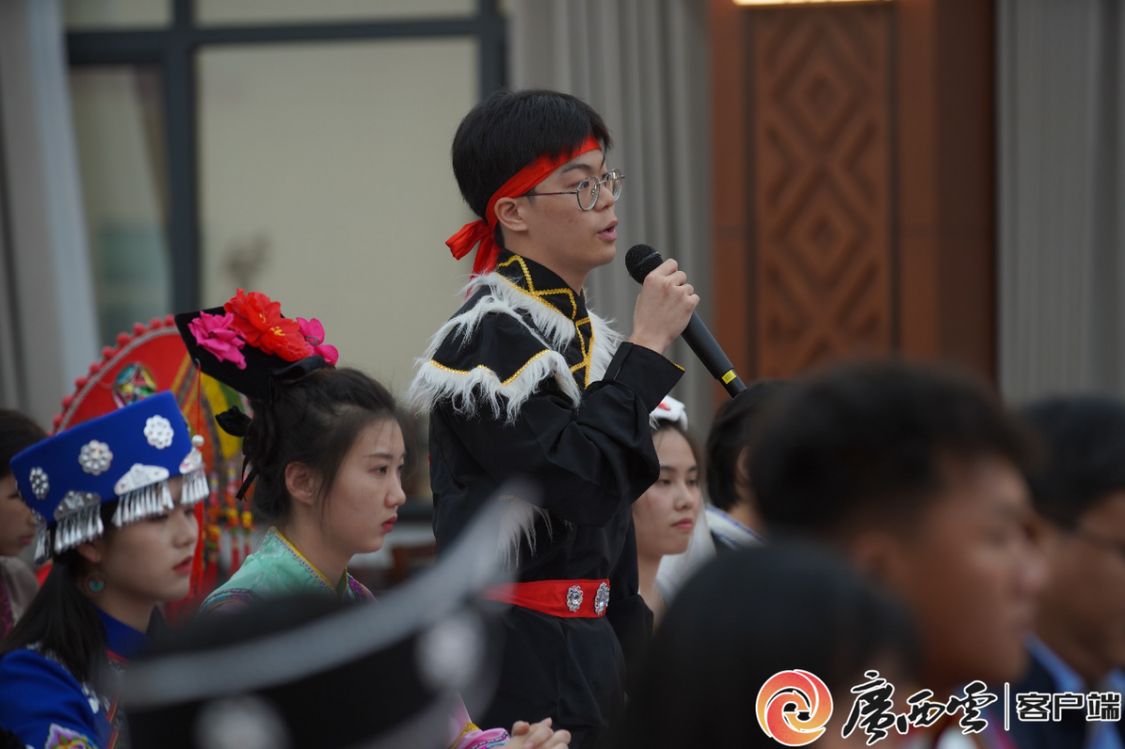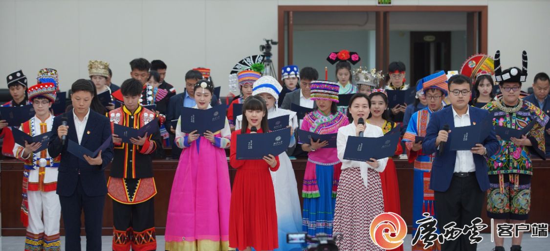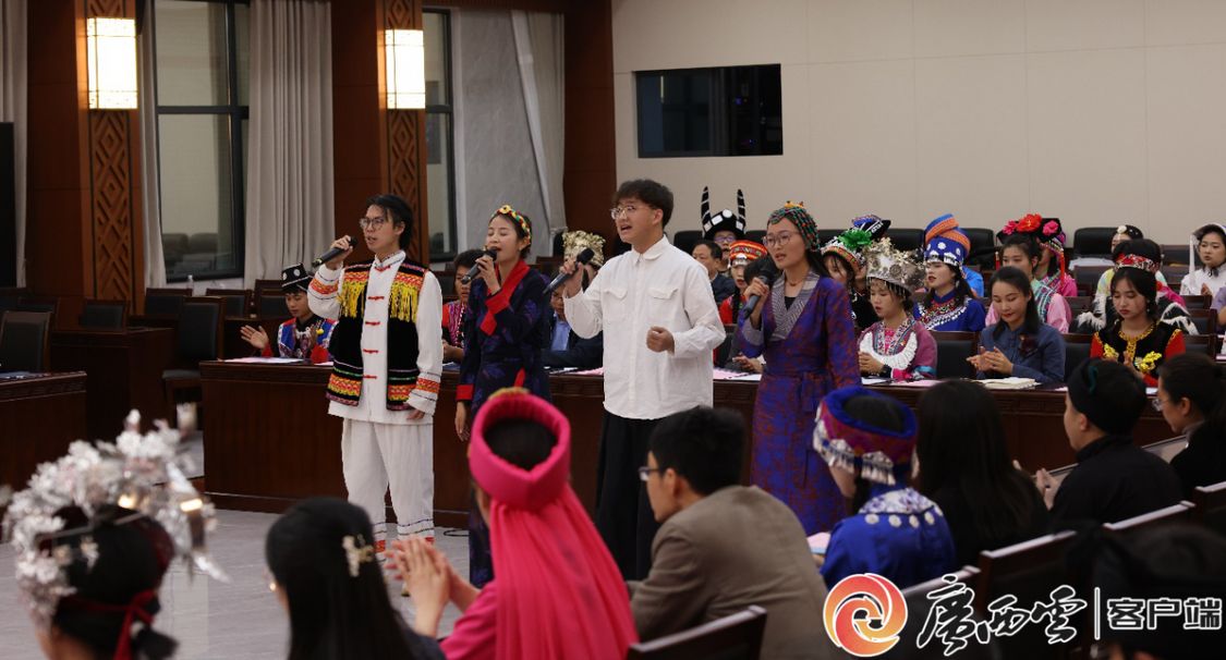在汉族学生杨佩宜、壮族学生覃铭玮、藏族学生赤列卓玛和土旦旺姆的带动下,与会师生唱响歌曲《再唱山歌给党听》,用歌声表达了感党恩、听党话、跟党走的坚定信念。