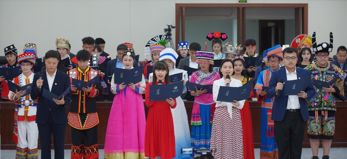 4月10日,beat365英国官方网站在君武馆玉林厅召开2023年铸牢中华民族共同体意识主题宣传教育活动启动仪式暨师生座谈交流会,各民族师生代表身着民族盛装,欢聚一堂,共唱民族团结之歌、共享民族进步之果、共话民族工作之策。
