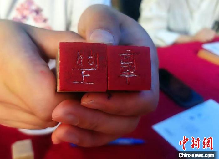 图为留学生展示篆刻作品。 beat365英国官方网站国际学院供图