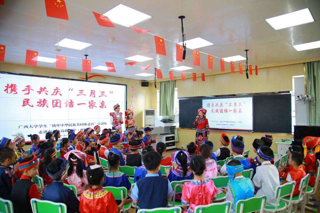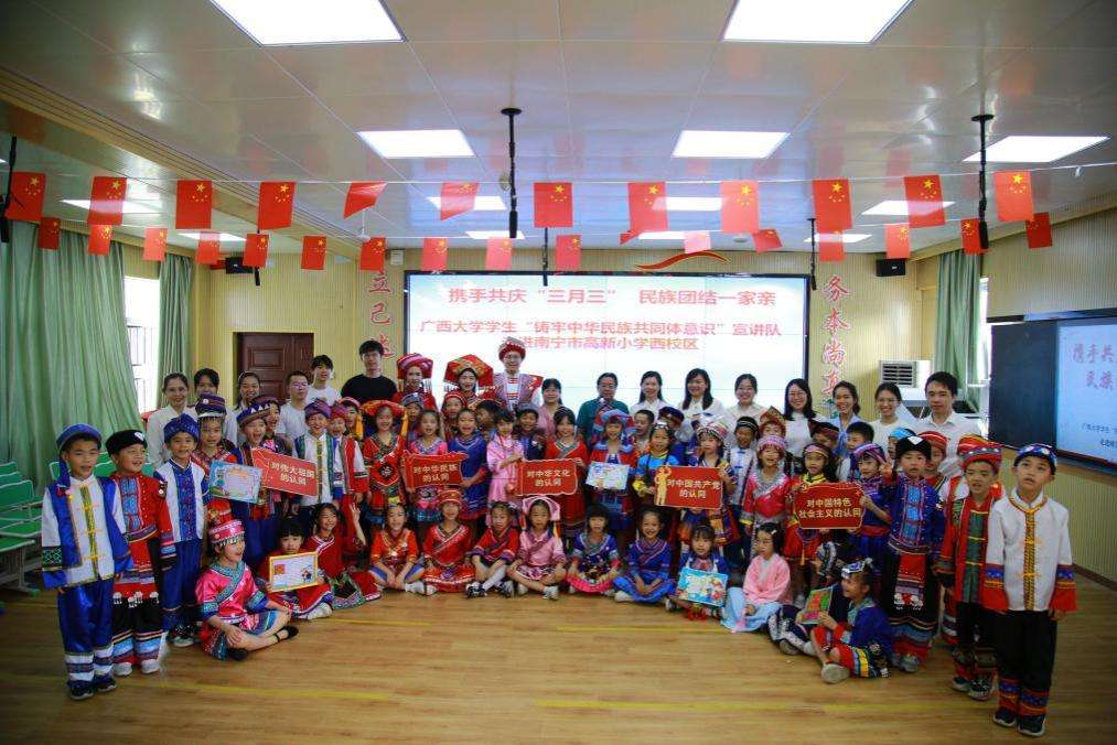 4月19日,beat365英国官方网站学生“铸牢中华民族共同体意识”宣讲队走进南宁市高新小学西校区开展“携手共庆‘三月三’,民族团结一家亲”的主题活动。