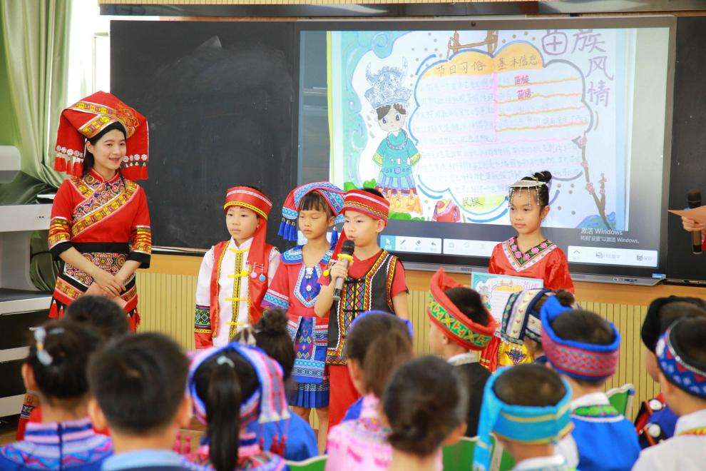 现场小学生们上台展示了由小组共同绘制的民族知识手抄报,包含了壮族、瑶族、苗族、侗族、毛南族的民族起源、民族饮食文化、民族艺术特色和民族语言等知识。