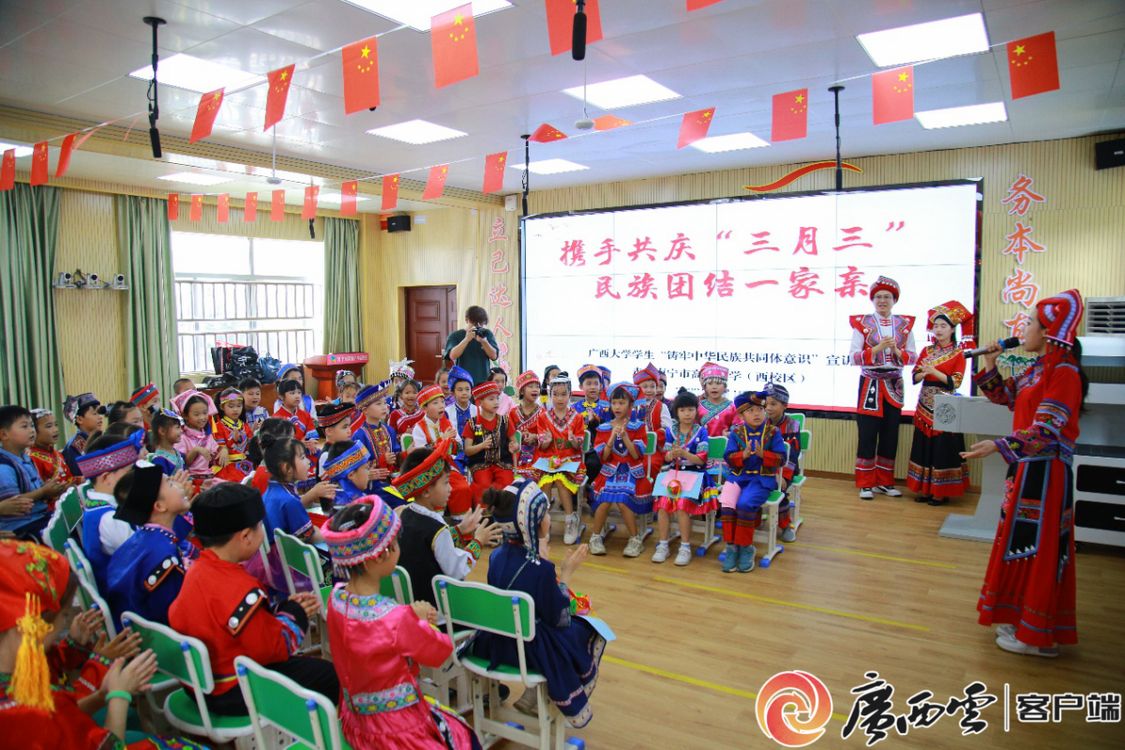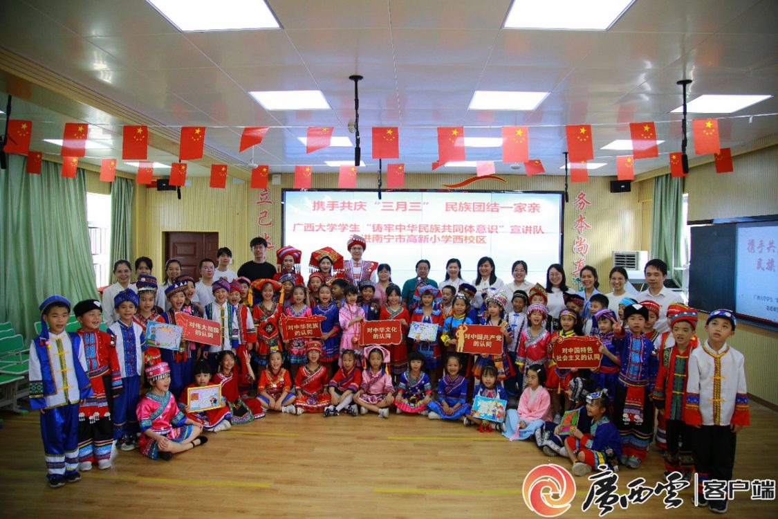 4月19日,南宁市高新小学西校区与beat365英国官方网站学生“铸牢中华民族共同体意识”宣讲队共同开展“携手共庆‘三月三’,民族团结一家亲”主题活动。