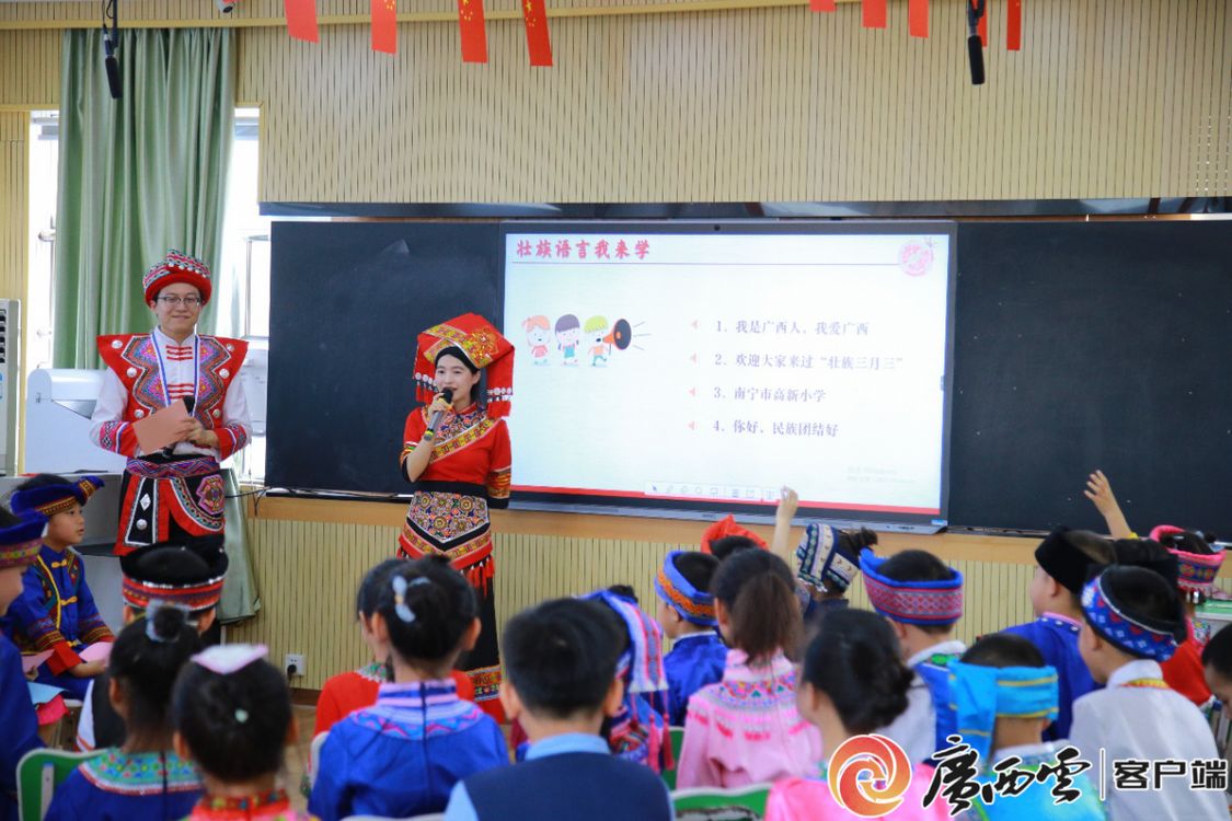 此外,本次活动最大的亮点是宣讲队成员别出心裁地带来了壮族人民的“声音”。宣讲队的壮族成员向小学生们教授了“我是广西人,我爱广西”“欢迎大家来过壮族‘三月三’”“南宁市高新小学”“你好,民族团结好”等壮语,同学们争先恐后地举手展示他们的学习成果,在原汁原味的壮语对话中更真切地体验壮族文化。