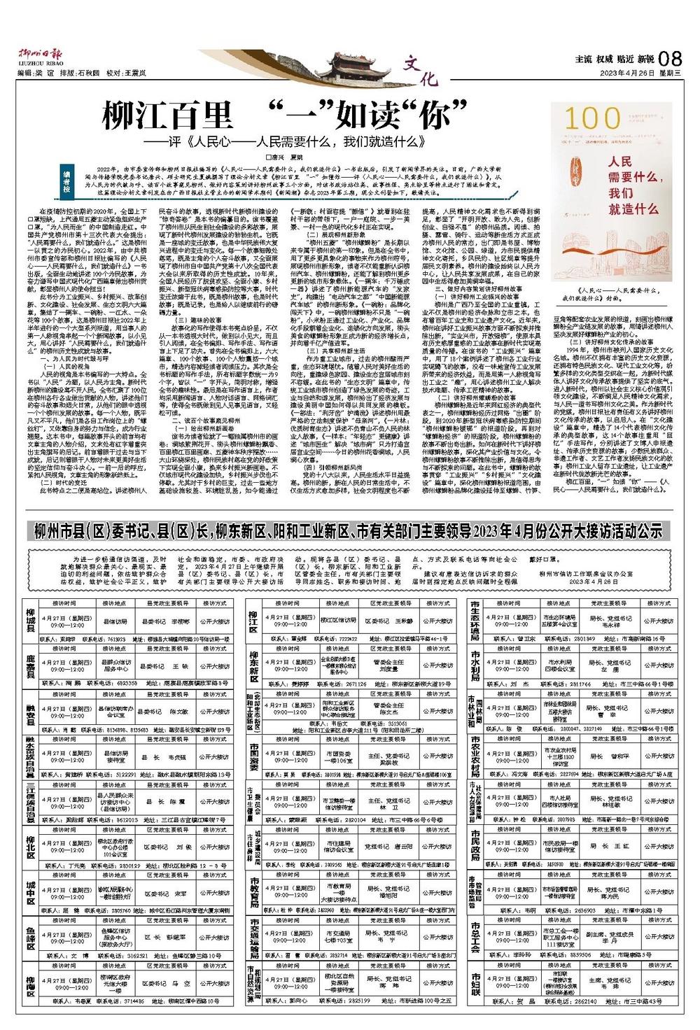 在疫情防控初期的2020年,全国上下口罩短缺,上汽通用五菱主动紧急组织生产口罩,“为人民而生”的中国制造走红。中国共产党柳州市第十三次代表大会提出:“人民需要什么,我们就造什么。”这是柳州一以贯之的为民初心。2022年,由中共柳州市委宣传部和柳州日报社编写的《人民心——人民需要什么,我们就造什么》一书出版,全面生动地讲述100个为民故事,为奋力谱写中国式现代化广西篇章做出柳州贡献,彰显柳州人的使命担当!