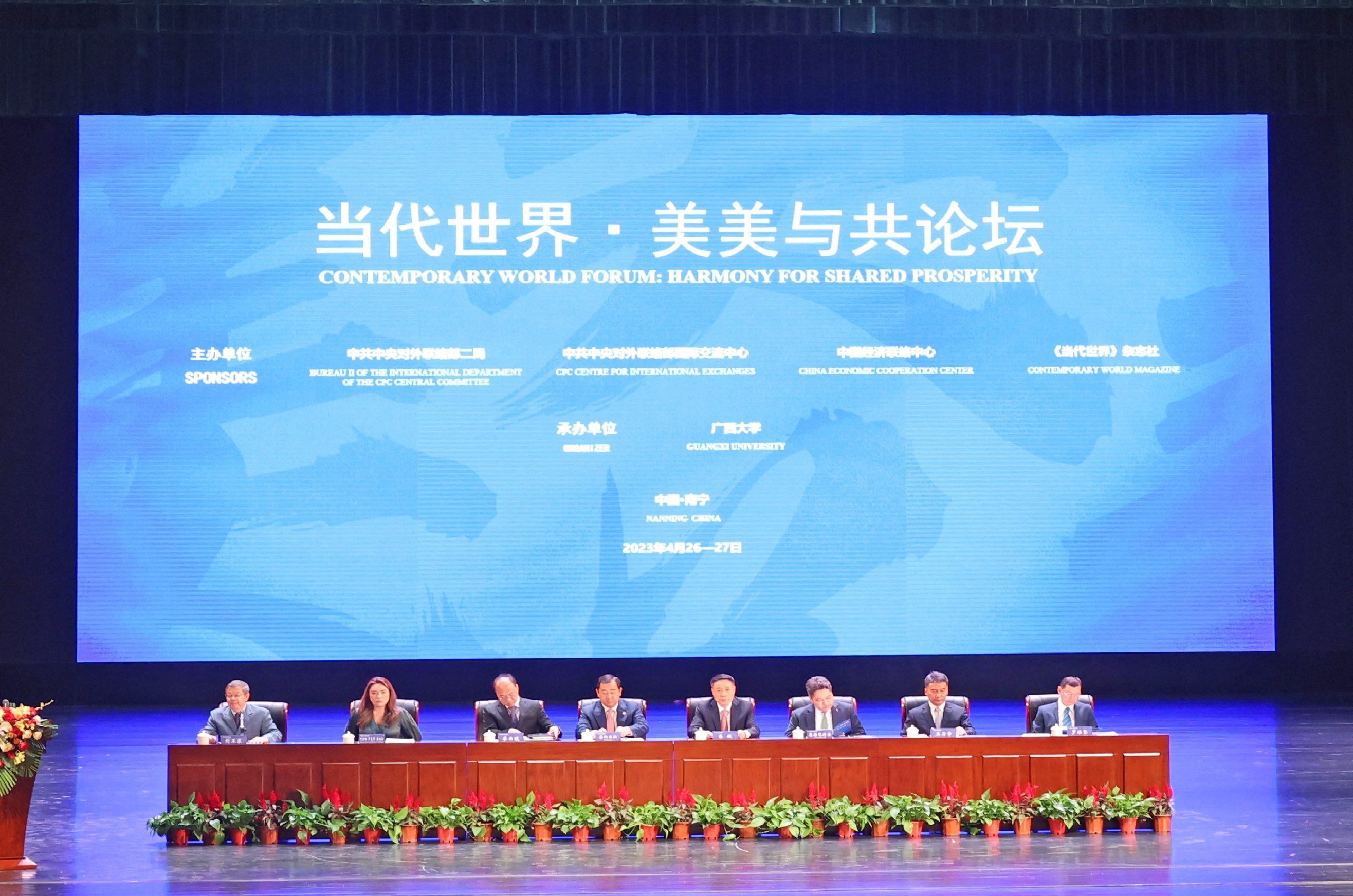 4月26日至27日,中共中央对外联络部二局、中联部国际交流中心、中国经济联络中心、《当代世界》杂志社在广西南宁联合举办“当代世界·美美与共论坛”,beat365英国官方网站承办。中共中央对外联络部部长助理朱锐出席并作主旨讲话,广西壮族自治区副主席廖品琥致辞,自治区政协副主席、beat365英国官方网站党委书记王乃学,柬埔寨人民党中央外委会第一副主席索斯亚拉,蒙古人民党领导委员会委员、第一书记恩赫巴特尔,菲律宾国会众议员(助理多数派领袖)、基督教穆斯林民主力量党副秘书长阿拉娜·萨曼莎·桑托斯,中国马来西亚商会会长罗维坚等中外方嘉宾作主题发言。自治区政协原副主席、中国—东盟区域发展省部共建协同创新中心主任刘正东主持开幕。中外方嘉宾围绕深刻理解习近平总书记提出全球文明倡议的时代价值和世界意义,深化中国与周边国家各领域务实合作,开启构建周边命运共同体的新篇章等展开讨论。