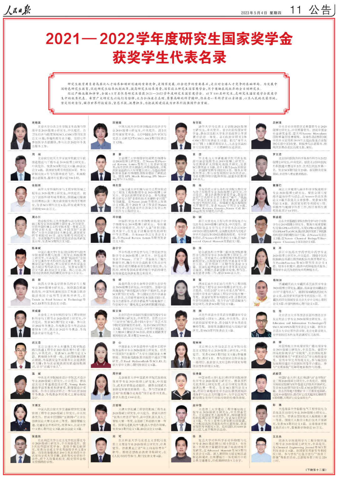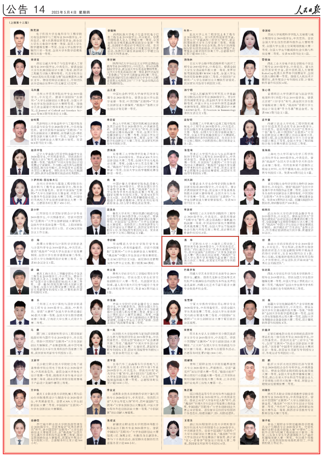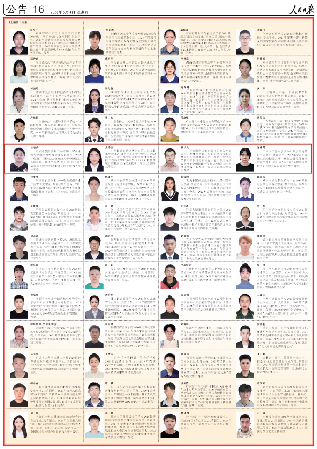 5月4日出版的人民日报,用六个整版刊登了100名研究生国家奖学金获奖学生优秀代表、100名本专科生国家奖学金获奖学生优秀代表和100名中等职业教育国家奖学金获奖学生优秀代表名录。其中,广西有6名优秀学生代表榜上有名。