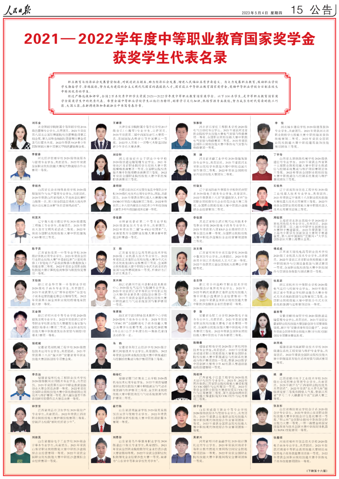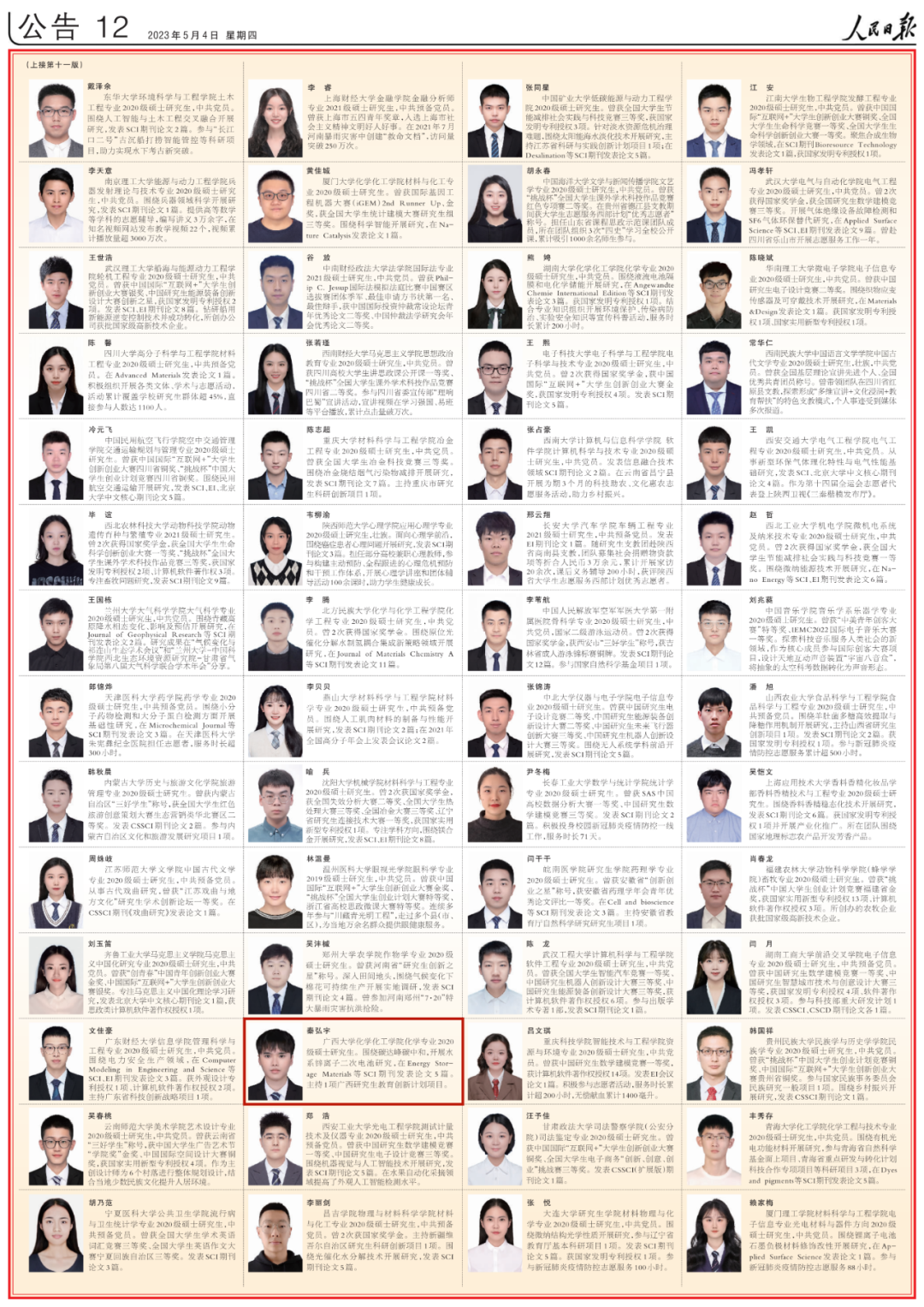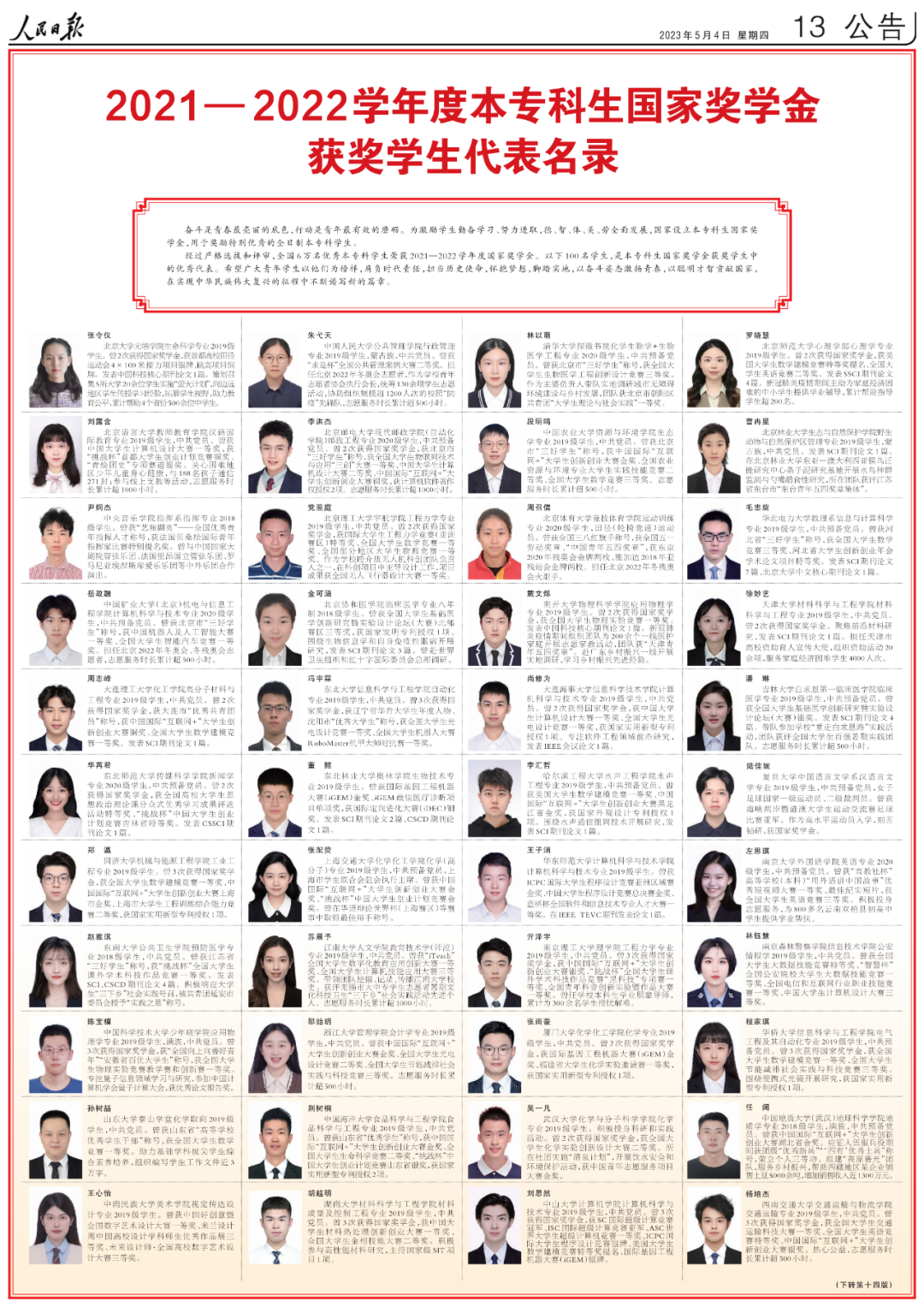 5月4日出版的人民日报,用六个整版刊登了100名研究生国家奖学金获奖学生优秀代表、100名本专科生国家奖学金获奖学生优秀代表和100名中等职业教育国家奖学金获奖学生优秀代表名录。其中,广西有6名优秀学生代表榜上有名。