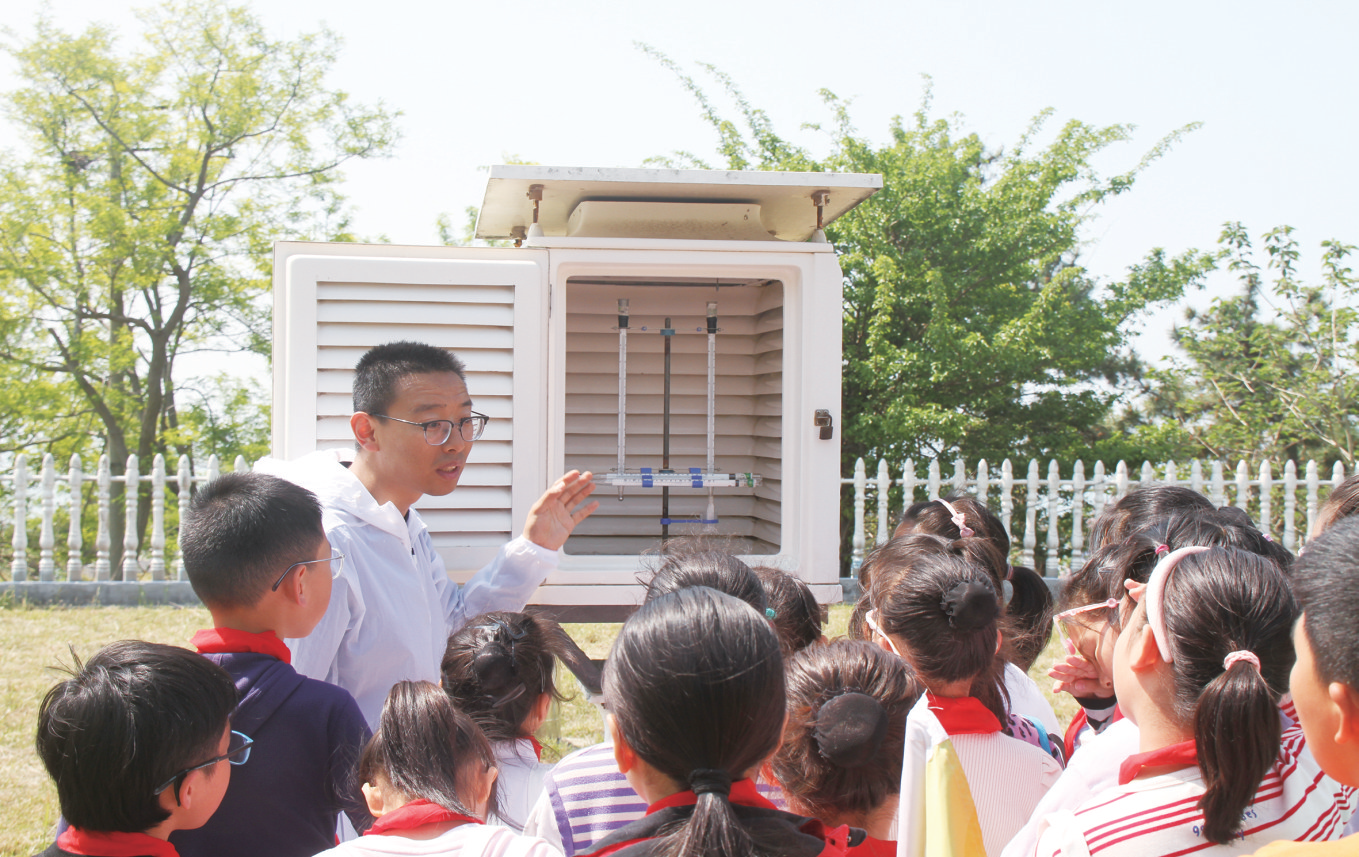小麦岛海洋站工作人员向同学们介绍海洋气象观测仪器设备和工作原理。