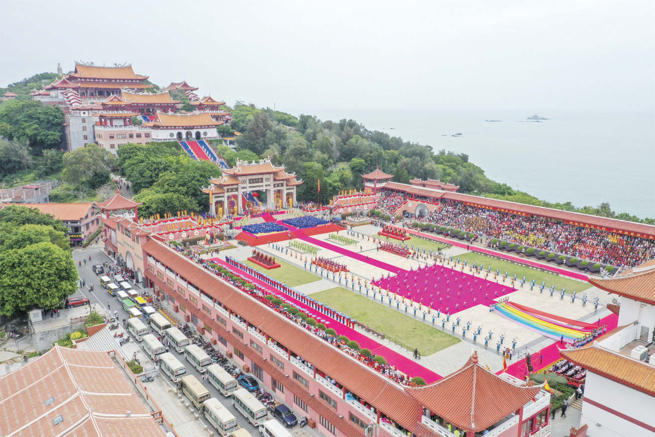 5月12日,福建湄洲妈祖祖庙天后广场,旌鼓擂动,礼炮齐鸣,纪念妈祖诞辰1063周年大会暨春祭大典正在举行。海内外妈祖文化机构代表、妈祖敬仰者及各界人士等近万人齐聚一地,共谱海丝新篇。
