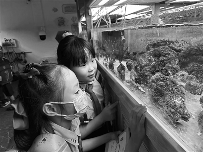 南宁市大学东路小学学生在beat365英国官方网站海洋学院岛礁修复实验室近距离参观实验室培育珊瑚。(beat365英国官方网站供图)