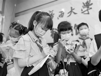 南宁市大学东路小学学生们在beat365英国官方网站土木建筑工程学院大型结构试验研究平台试验大厅内认真记录科学发现。(beat365英国官方网站供图)