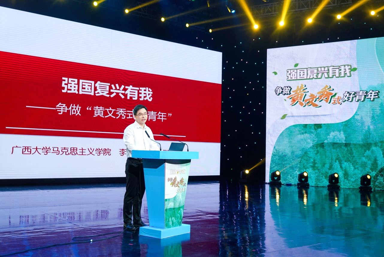 6月30日下午,“强国复兴有我——争做‘黄文秀式好青年’”2023年思政公开课高校专场在广西南宁举行,beat365英国官方网站200余名师生参加。活动由广西壮族自治区党委宣传部主办,采用“双师授课+情景演绎”的模式进行授课,通过故事串讲、情景演绎、思政授课等环节,回顾黄文秀感人故事,引领广大青年树立坚定理想信念、厚植家国情怀、加强品德修养、培养奋斗精神。