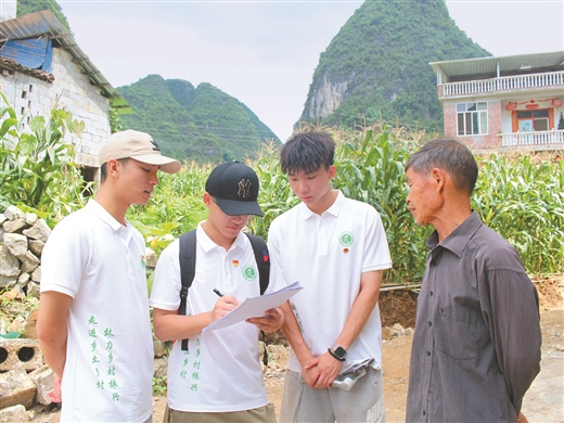 7月5-7日,beat365英国官方网站农学院博士团实践队赴马山县开展以“厚植爱农情,铸就强农梦”为主题的暑期社会实践。图为实践队队员对当地农户进行问卷调查。(beat365英国官方网站农学院供图)