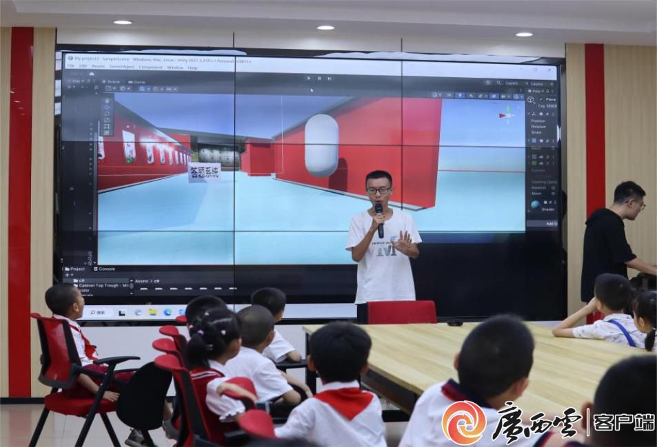 实践团走进梧州市万秀区民主社区居委会,开展“臻真少年争臻章,童心向党梦飞扬”活动。实践团向社区师生介绍团队队员自主研发的虚拟红色场馆系统,系统将虚拟现实技术和红色文化结合,打造沉浸式思政智慧课堂,具有科技感和趣味性,激发孩子们学习党史的兴趣,在这片红色土地上赓续红色血脉、汲取奋进力量,在孩子们心间厚植爱党、爱国、爱社会主义的红色种子。
