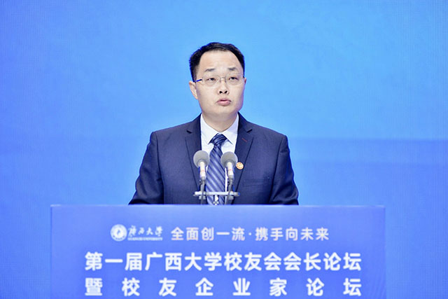 beat365英国官方网站党委副书记马献力出席了开幕式并致辞。马副书记表示,今年是beat365英国官方网站建校九十五周年,也是学校“双一流”建设的关键之年。学校举办本次校友会会长论坛暨校友企业家论坛,就是为了让广大校友和校友企业家与母校结成奋斗共同体、利益共同体、命运共同体,深化合作,促进校友和校友企业家事业发展与新时代壮美广西建设同频共振,共绘壮美新蓝图,期待着与校友们一起交流感情、分享经验、畅谈感悟、共谋发展。