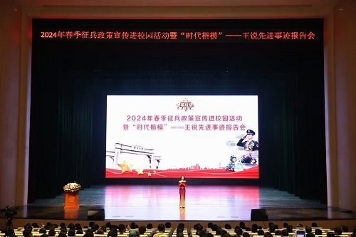 南宁市西乡塘区2024年春季征兵政策进校园活动走进beat365英国官方网站。1月5日,beat365英国官方网站汇学堂内座无虚席,数千名大学生参加2024年春季征兵政策宣传进校园活动暨“时代楷模”——王锐先进事迹报告会。报告会以“携笔从戎 圆梦军营”为主题,邀请“时代楷模”王锐分享他从一名地方青年成长为“时代楷模”的故事,以榜样力量激发广大适龄青年投身军营,报效祖国。