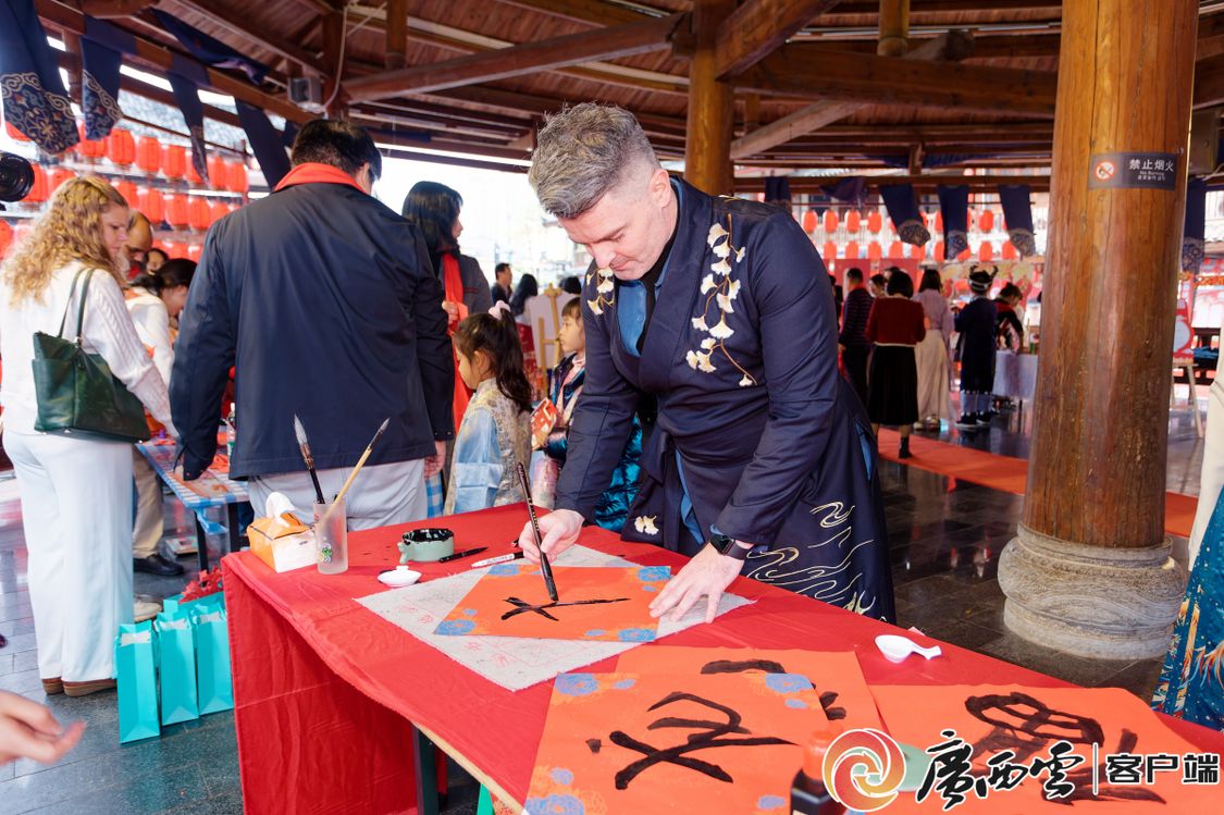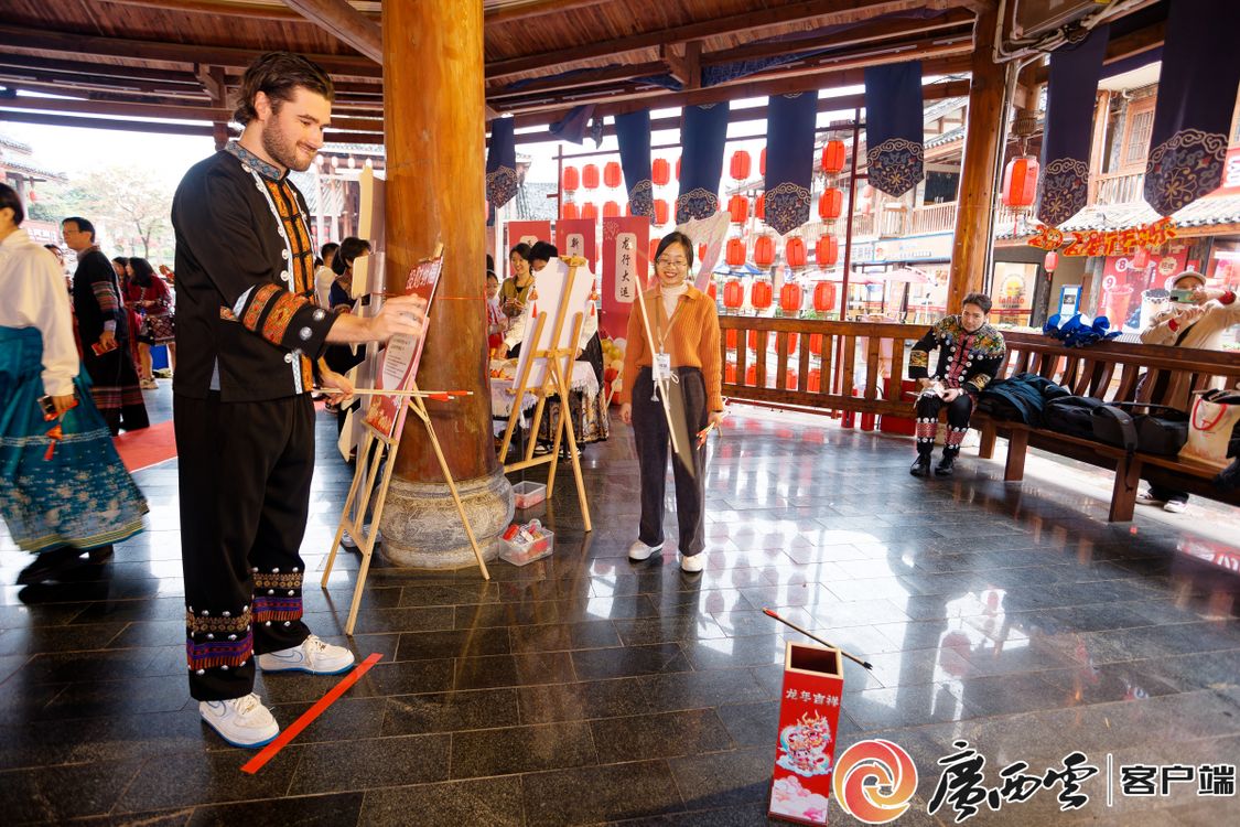 活动现场,外国专家参与传统民俗游戏,沉浸式体验中华传统文化的独特魅力。游园会上,投壶、抛圈、写福字、剪窗花等各式各样原汁原味的传统游戏让外国专家在这场古风游园会“穿越”,活动内容乐趣横生、精彩纷呈,新春氛围活泼生动、热闹非凡。在广西水牛研究所工作的意大利籍研究员阿尔弗雷多表示对民族服饰非常感兴趣,全程穿着炫丽的特色服饰参与了游园活动。来自泰国的文婷是beat365英国官方网站中国—东盟研究院泰国研究所副所长。她说:“虽然春节不是我们国家的传统节日,但在中国,浓厚的节日气氛,也让我很想念家乡。”来自英国的亚历克斯参与了‘投财纳福’和‘画龙点睛’等项目后表示,这些传统民俗活动非常有趣,让我更加了解中国新春佳节的习俗和文化。外国专家们对主办单位的精心筹备和新春祝福表示感谢,浓厚的节日氛围让人流连忘返,希望以后能够经常来参加相关的活动。